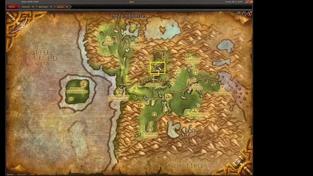 After taking the potion, fly directly south to Feralas, heading specifically to the Coliseum in the Dire Maul area.