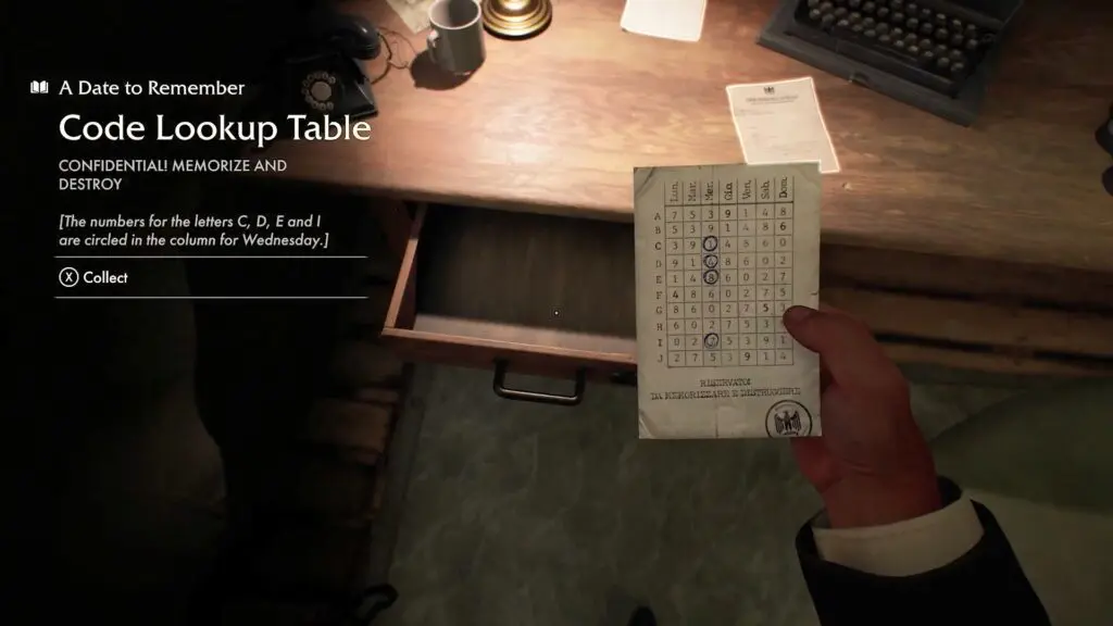 Next, search the desk drawer to find a Code Lookup Table with a circle number for Wednesday.