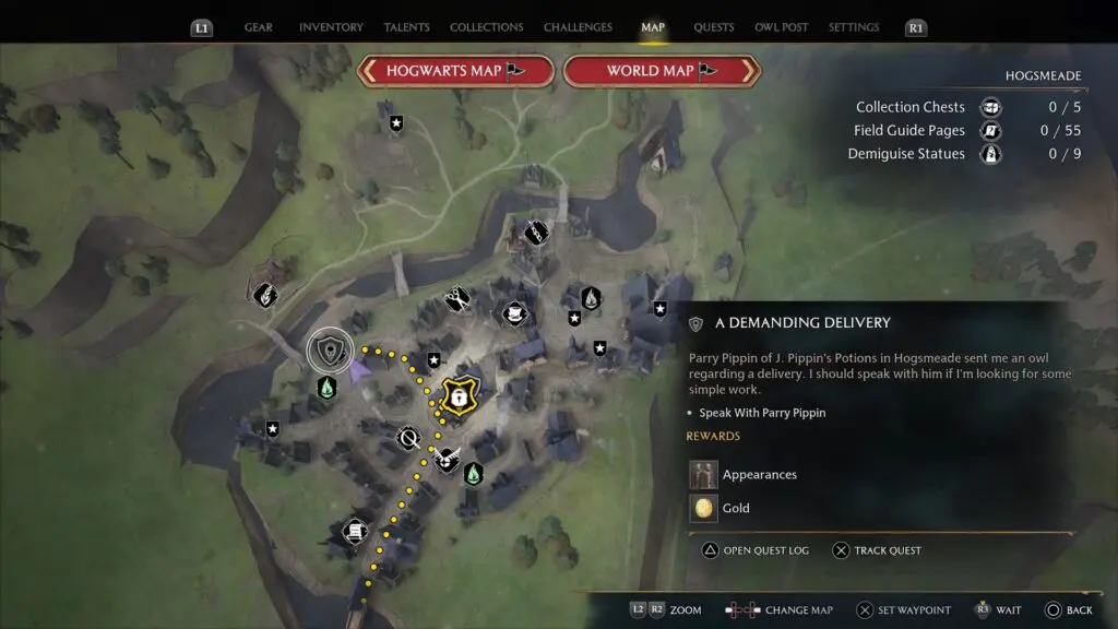 After the quest becomes available, travel to Hogsmeade. Then go to J. Pippin’s Potions shop, which is on the northwest side of the area s shown in the pictures below. Talk to Pappy Pippin in the shop and he will give your four invisibility potions and will ask you to deliver three invisibility potions to Fatimah Lawang.