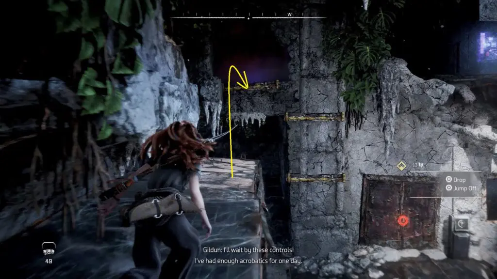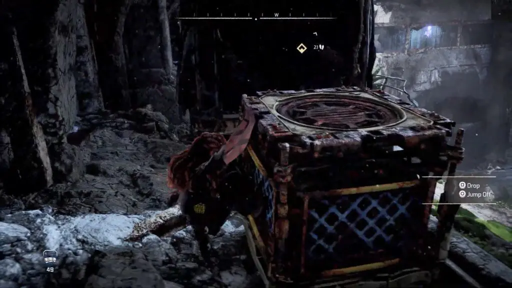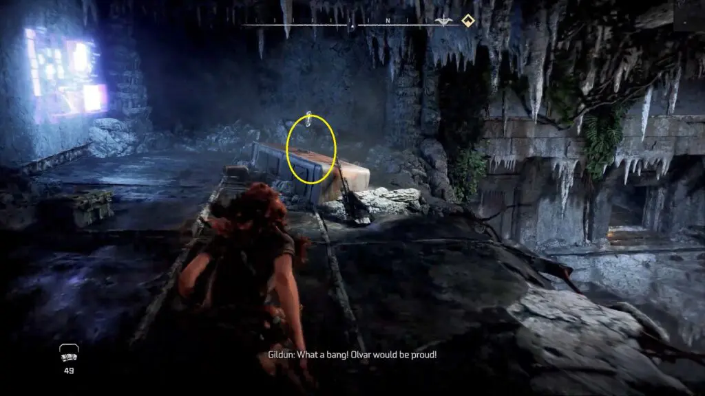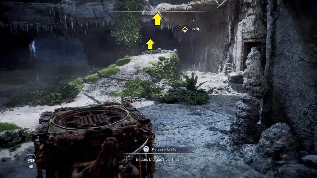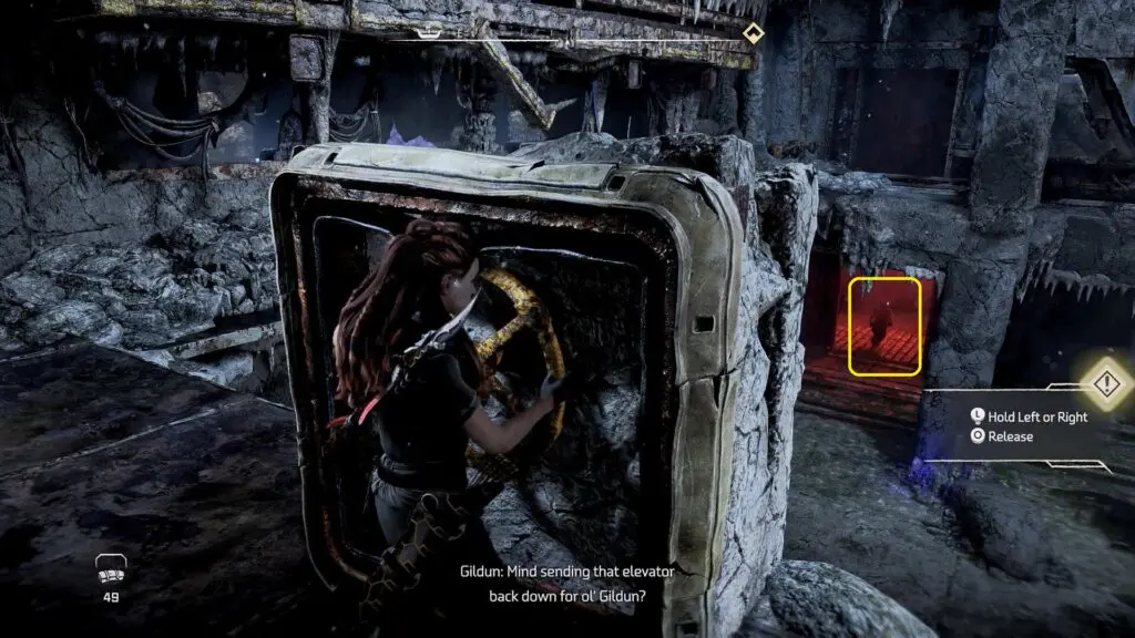 Return to the ground and drag the crate into the lift. You’ll have to wait till Gildun approaches the wheel and raises the lift.