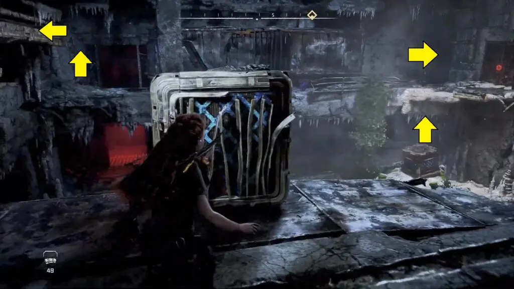 After climbing, proceed to the right side to find a vent in a room. Open the vent and crawl through it. After exiting the vent on the opposite side, you must climb up to this ledge and cross to the other side.