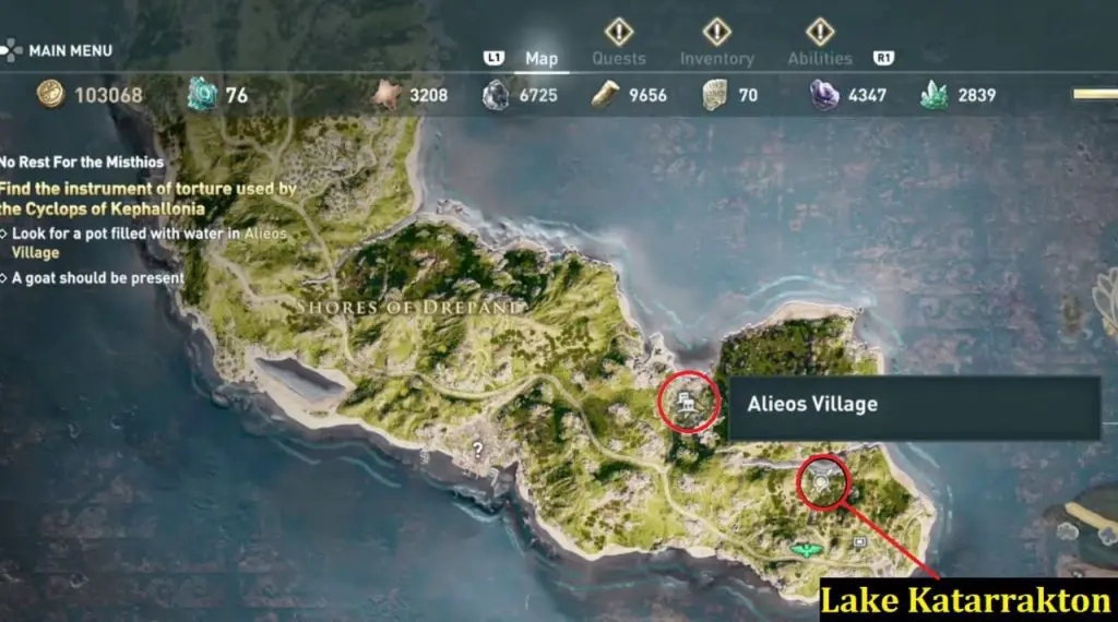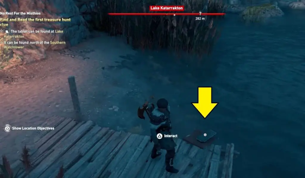 The tablet can be found at Lake KatarraktonTablet is placed on a wooden dock. When you pick it up, you’ll get the second clue to look for a pot filled with water in Alieos Village. This location is west of the first clue.