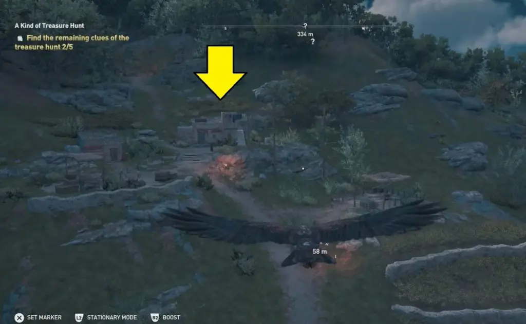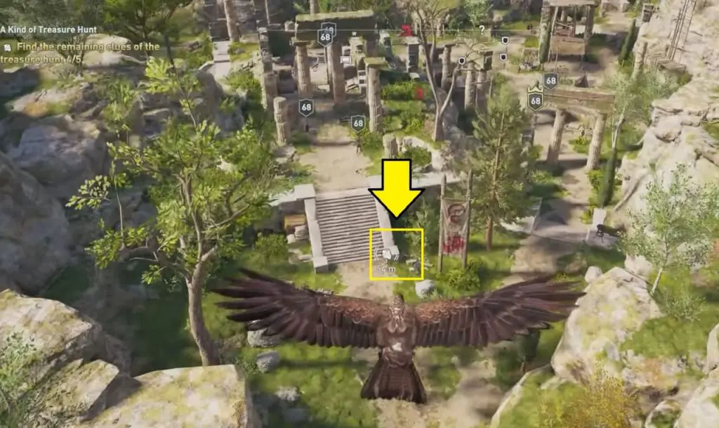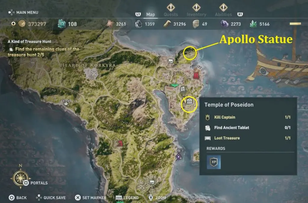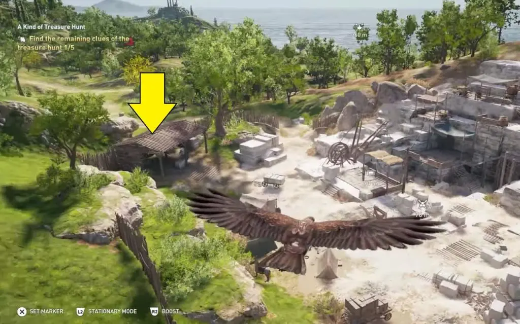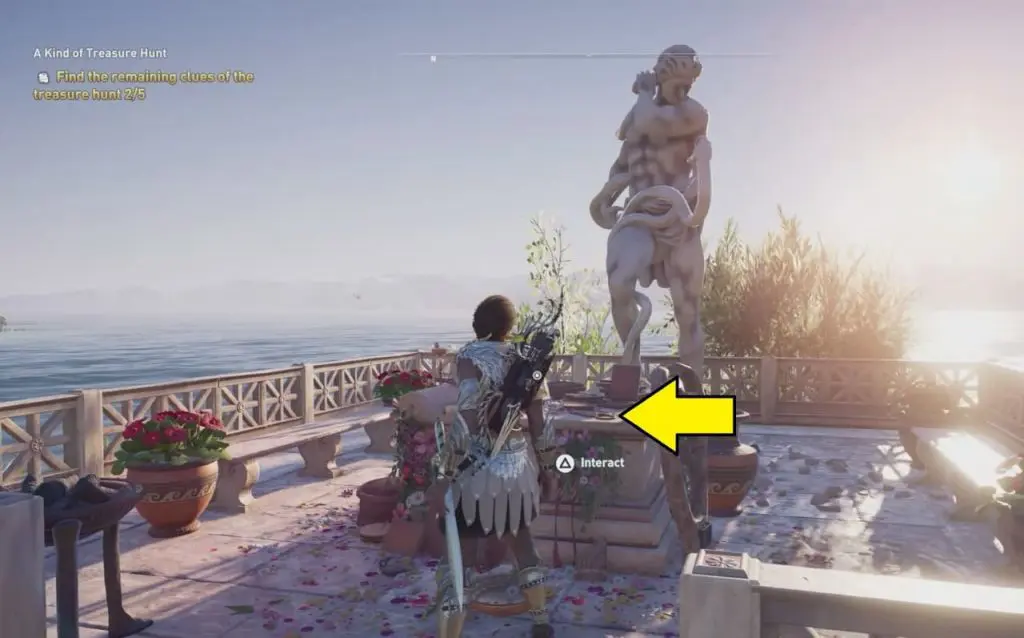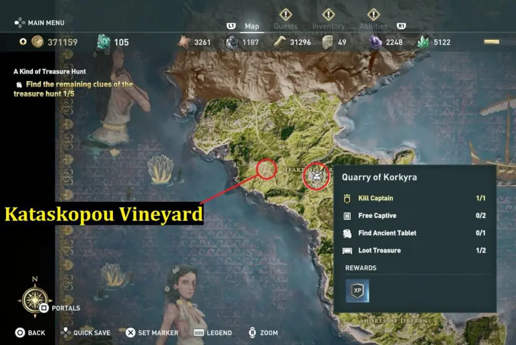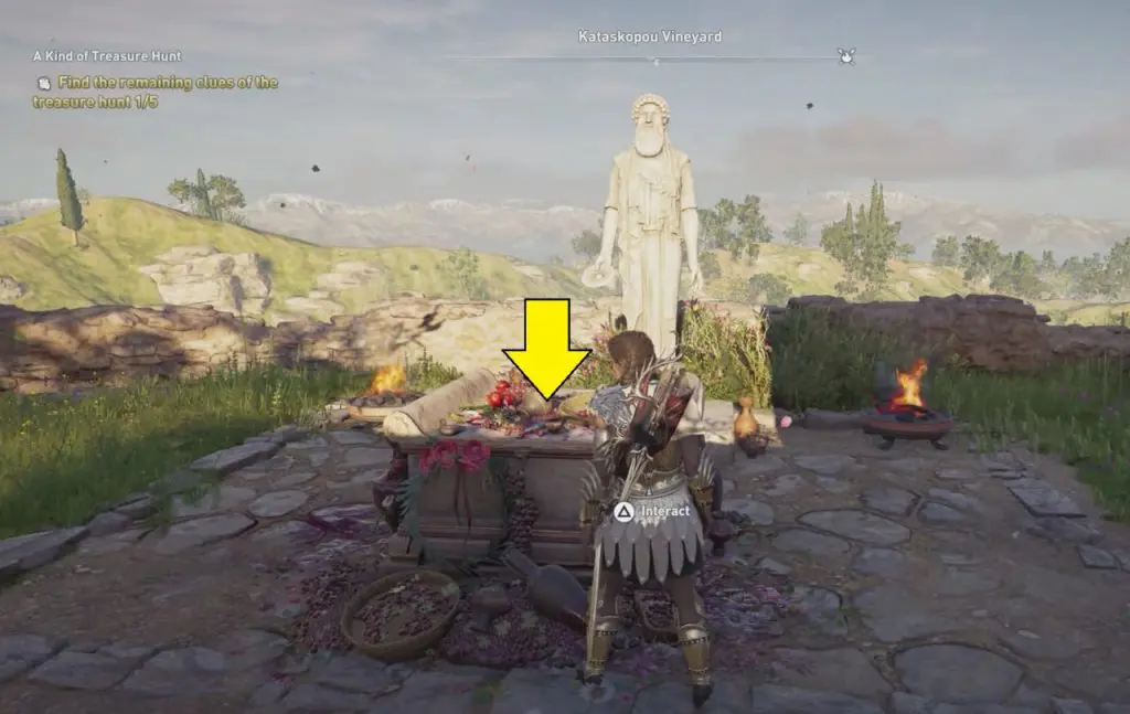 The ancient tablet is inside a shed at the Quarry of Korkyra. Clue will direct to Kataskopou Vineyard. Interact in front of the statue to complete all 5 Treasure Hunt Clues