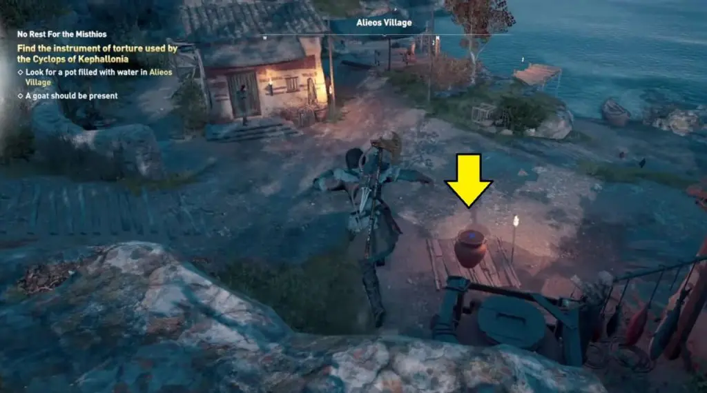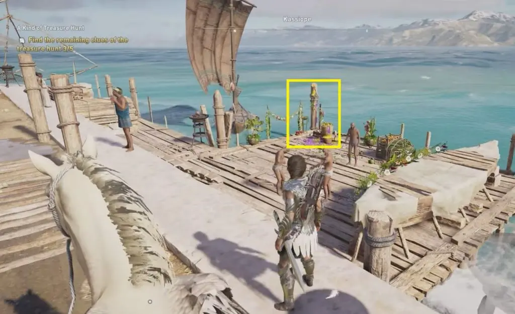 Here you will get captured by the enemies. Come out of the cage, sneak past the enemies to collect your gear near a dock. Here you will get another treasure clue note that takes you to the Lestikos Settlement, which is located on the southern shores of Drepani.