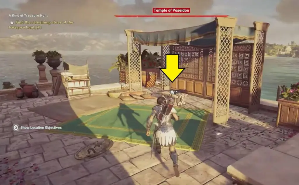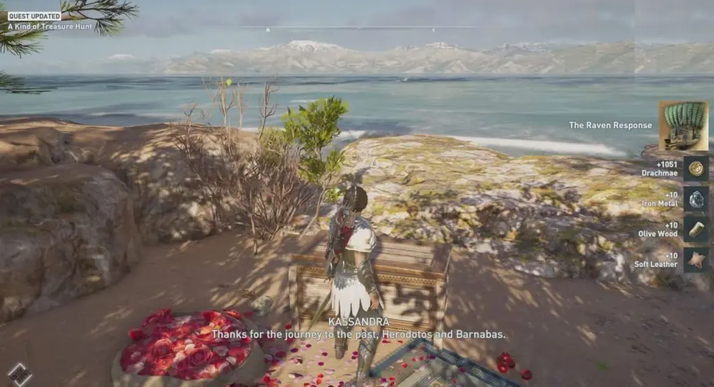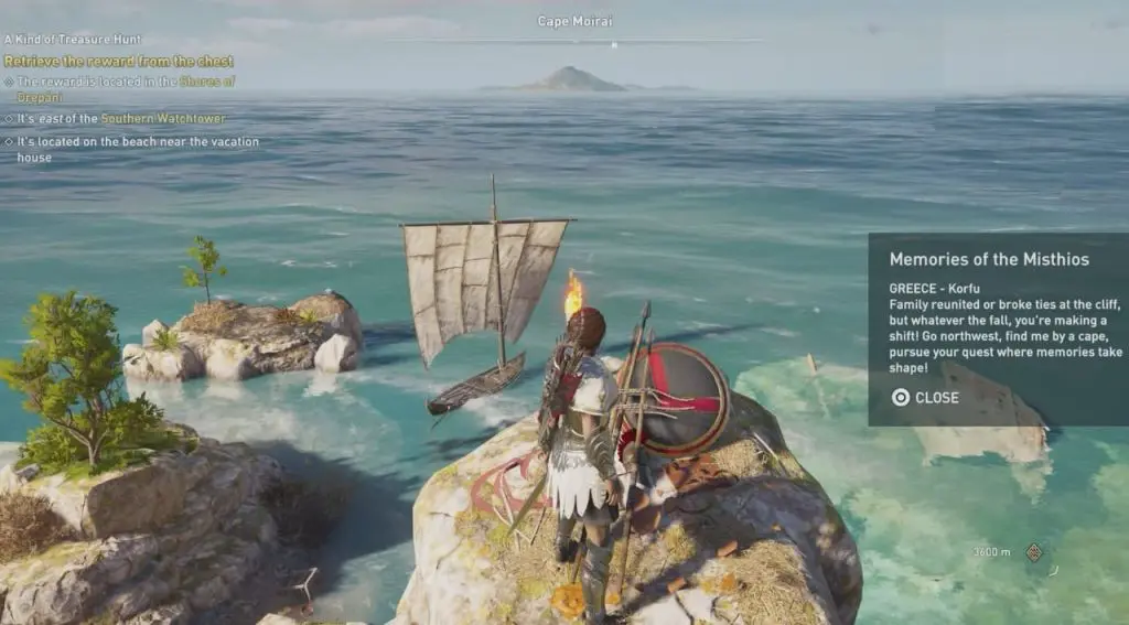 As the game starts, the first main quest is “No Rest for the Misthios“. Here you have to collect Kassandra’s gear and talk to her friends to start the treasure hunt. The first clue sends you to Lake Katarrakton to look for a tablet. A Kind of Treasure Hunt is a sidequest where you need to find the last 4 Ancient tablets.