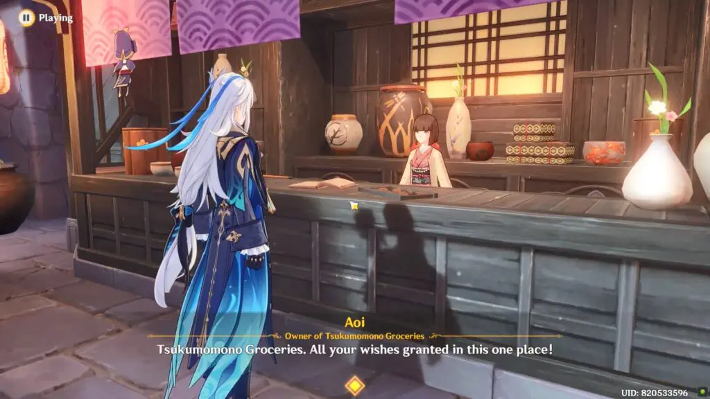 Speak with Aoi (NPC), the owner of Tsukumomono Groceries.