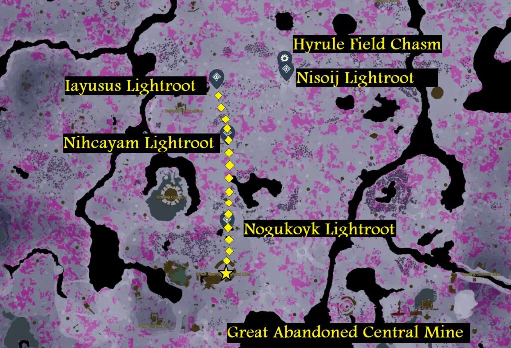 Starting from there, you must head south. As you progress, activate the Nihcayam Lightroot and the “Nogukoyk Lightroot” along the way. Continuing to follow the southern path, you will eventually arrive at a temple with lights in Great Abandoned Central Mine.
