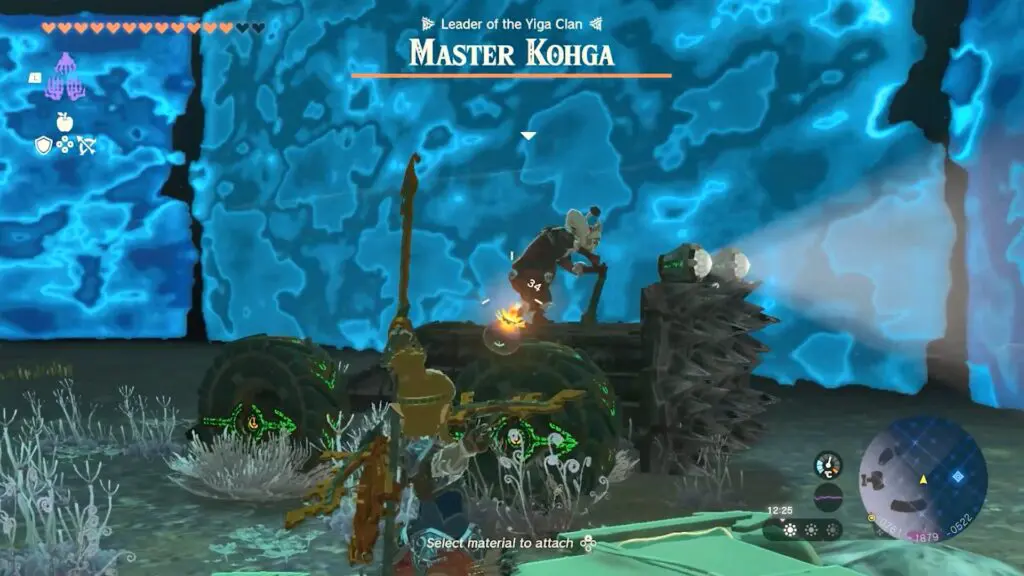 Prepare for a boss battle with Master Kohga, a member of the Yiga clan in Zelda: Tears of the Kingdom. Master Kohga will use their car to try and run you down. Stun and knock them off their vehicle with a bow shot, then swiftly approach and attack with your sword to weaken them.