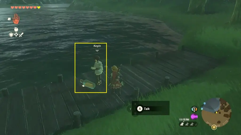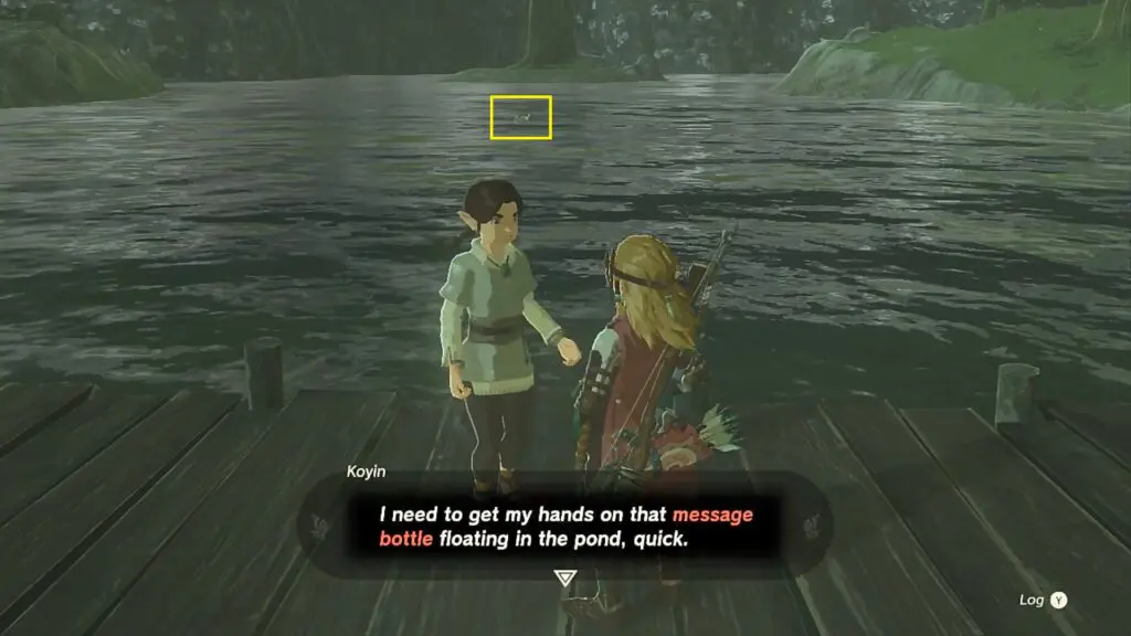 Go to the dock in the Hateno Pasture and talk to the NPC named Koyin there as shown in the pictures below. Koyin will ask you to bring the bottle from the pond as shown in the third picture below.