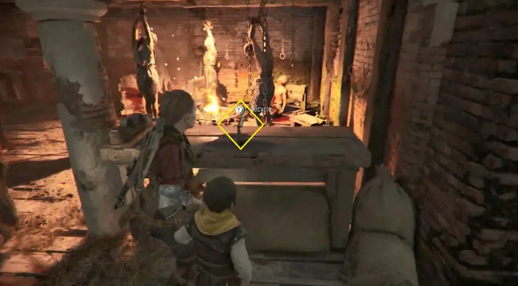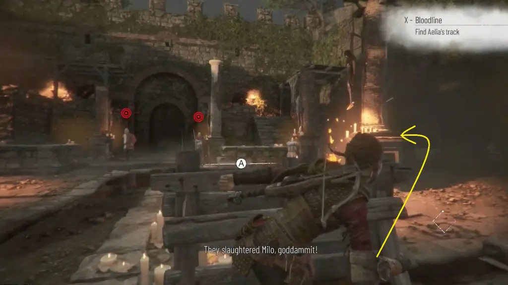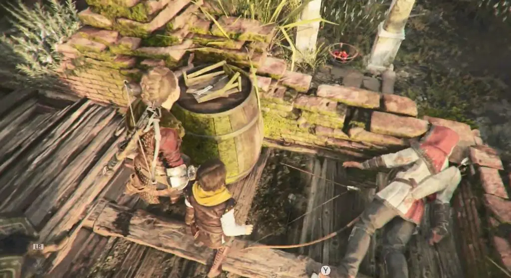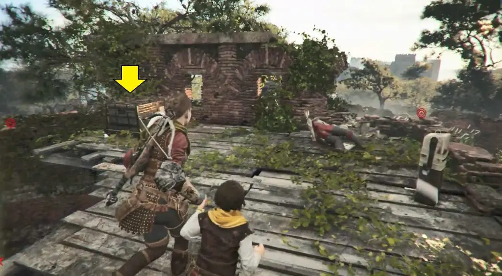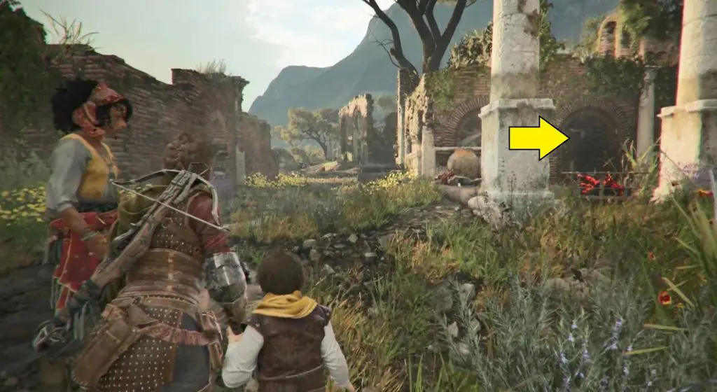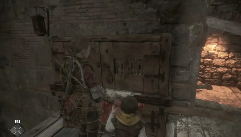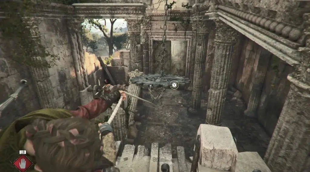 Once you reach an old temple, command Sophia to interact with a wheel while you use the rope crossbow on a chandelier to smash open a door.