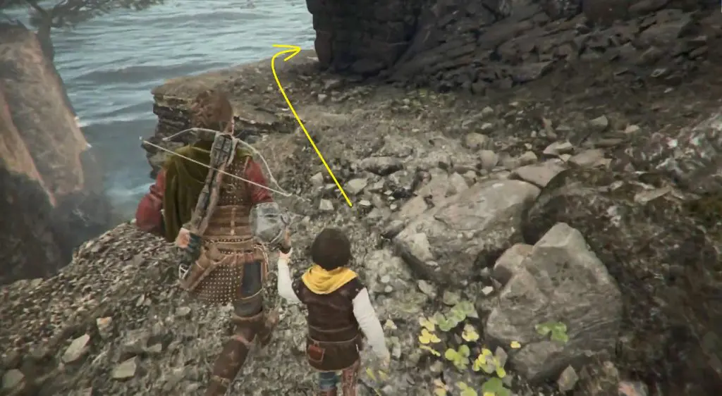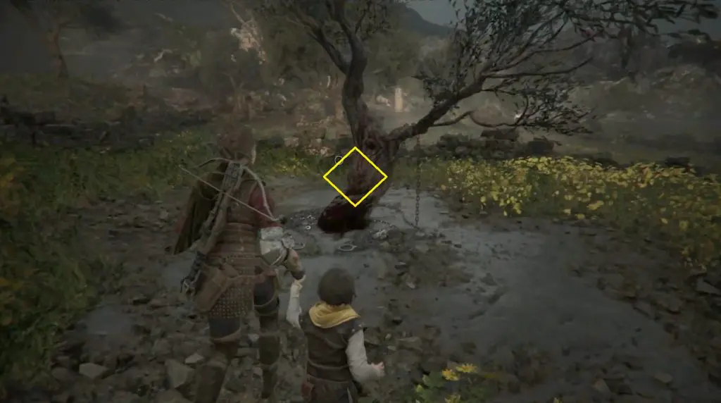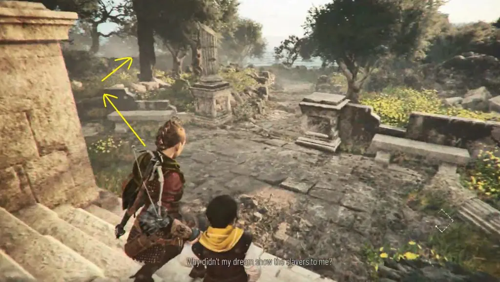 Hugo will run through a field and stop beside a tree after a cutscene. Enter the ruins beside him. Turn left and use your grappling hook to open a wall. Climb up the wall and turn right to find the Souvenir tree.