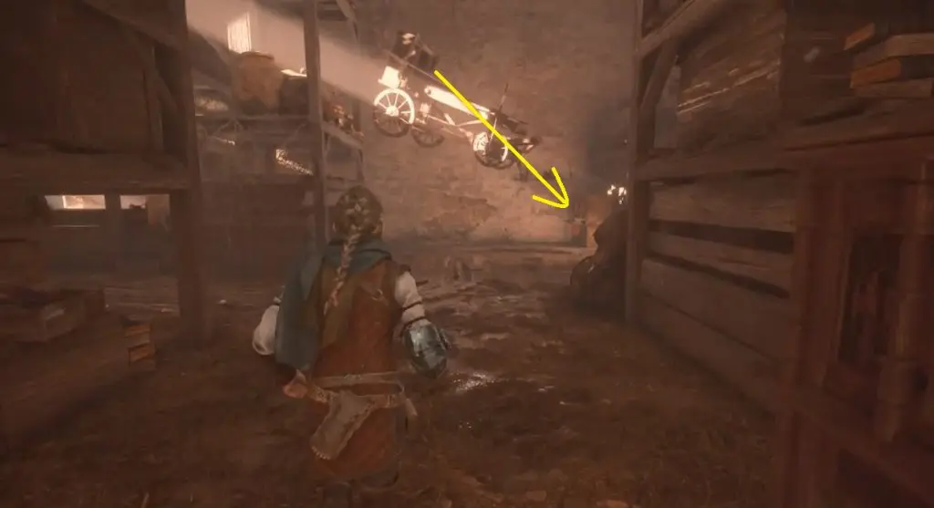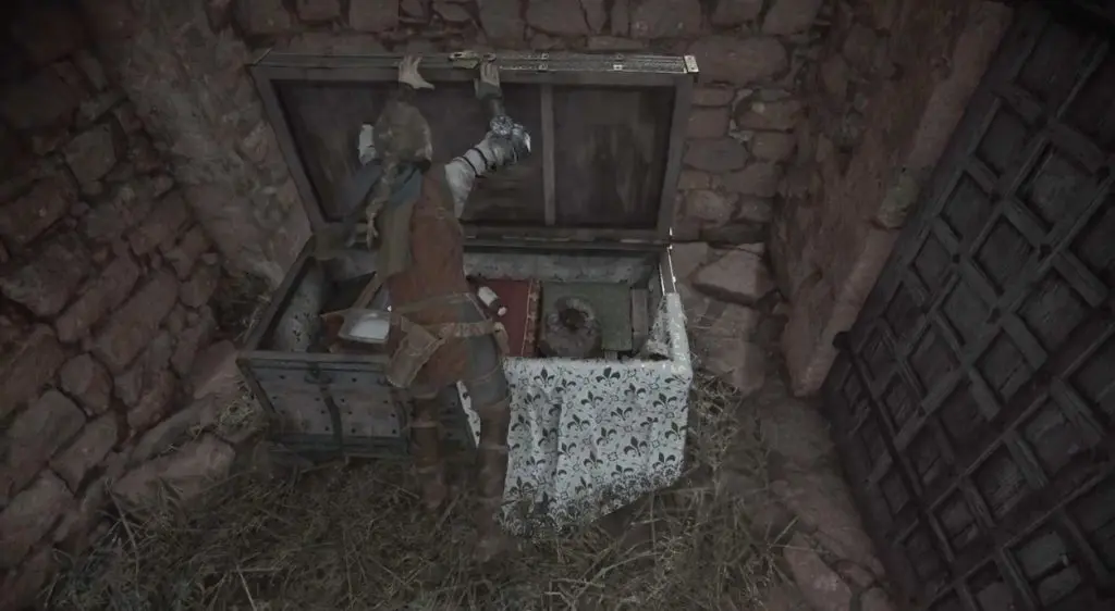 After the first workbench, the player needs to pass through a rat-infested village. Enter the building on the far left to find a large chest containing a tool. While reaching the last building, enemy guards will be coming out of a large gate. Players can light the torch to cross over safely.