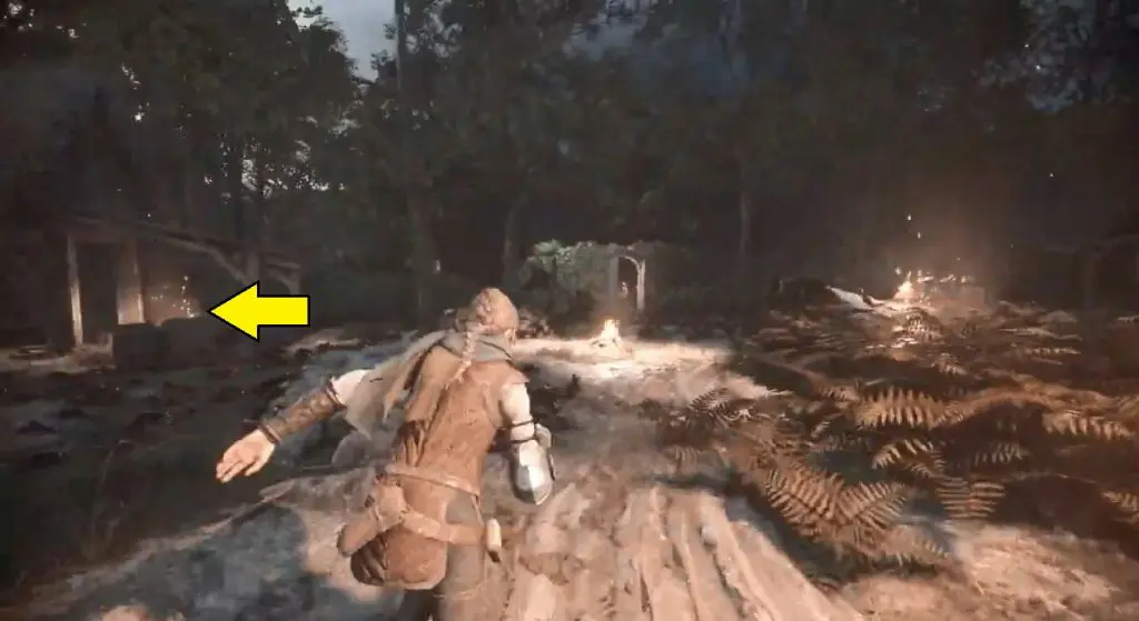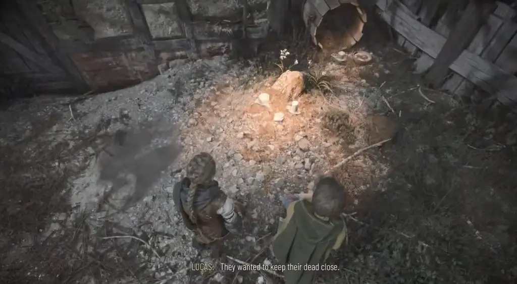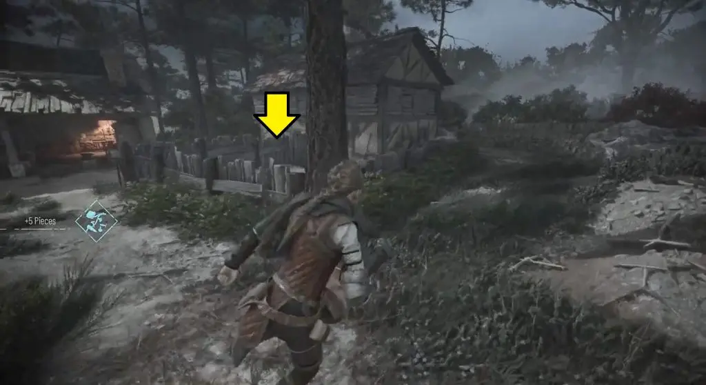 After leaving the city, you will reach a forest area. Look for a hut with a fenced garden on the left side. Go to the other side of the fence and use your sling to strike the door’s lock. Enter the garden and interact with the grave to retrieve the Souvenir.