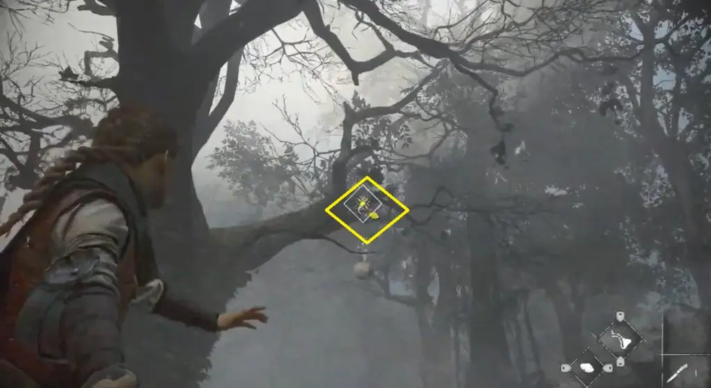 After the rat-infested village, the player will arrive at the herbalist’s hut. Look for a large tree on the left with a flower pot hanging from it. Shoot the metal chain of the flower pots with the sling to drop it and collect the Camomile flower.