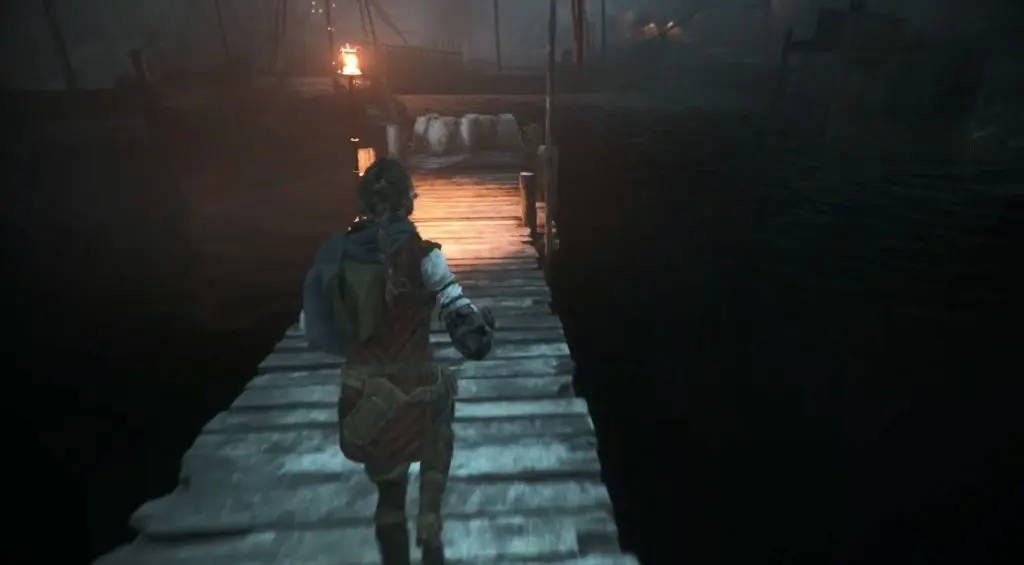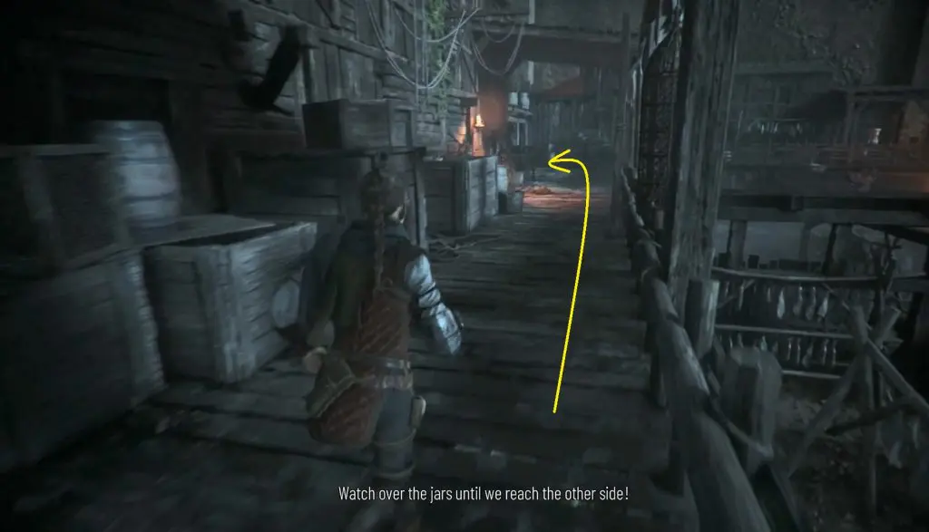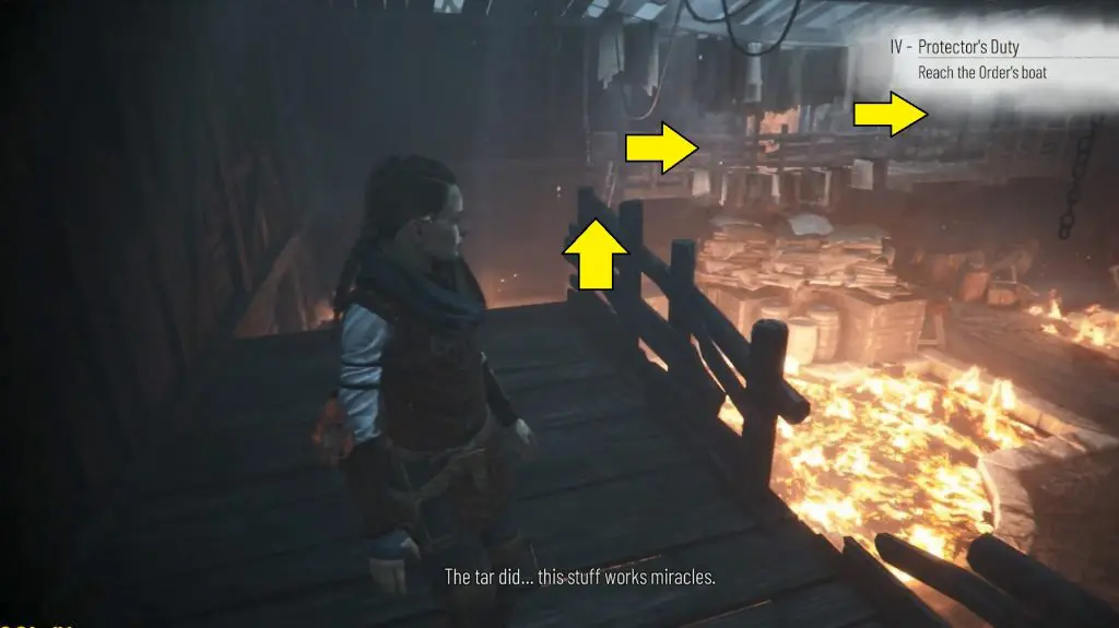 Exit the tar workshop and follow the linear path until you hit a dead end with a wooden plank blocking the gap. Look to another side for a chain.