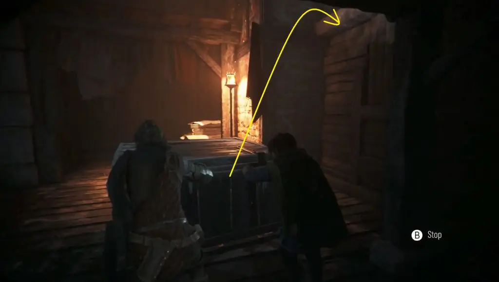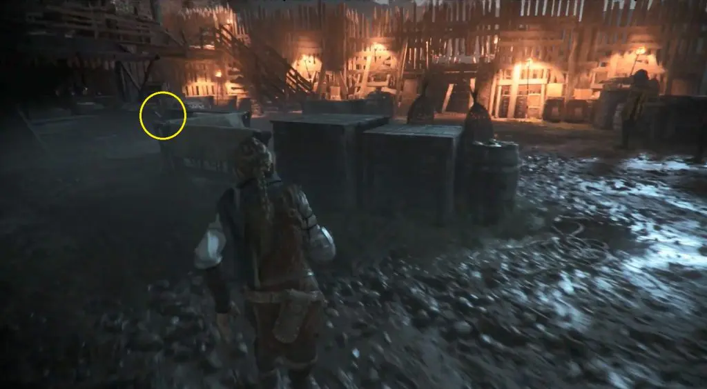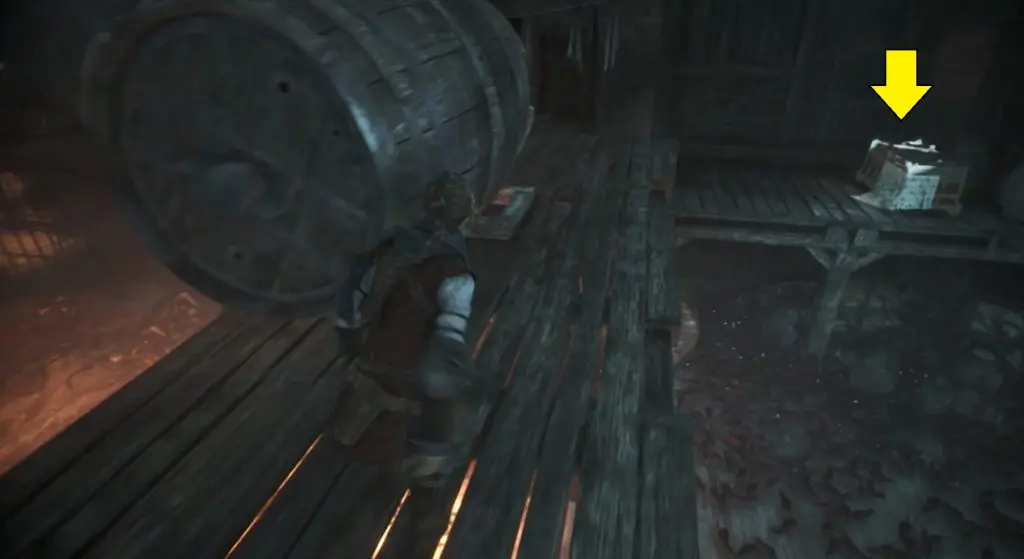 Return from the previous collectible place and follow the regular path. Continue straight, squeeze between several boxes, climb a ladder, and then keep going until you reach the end.
