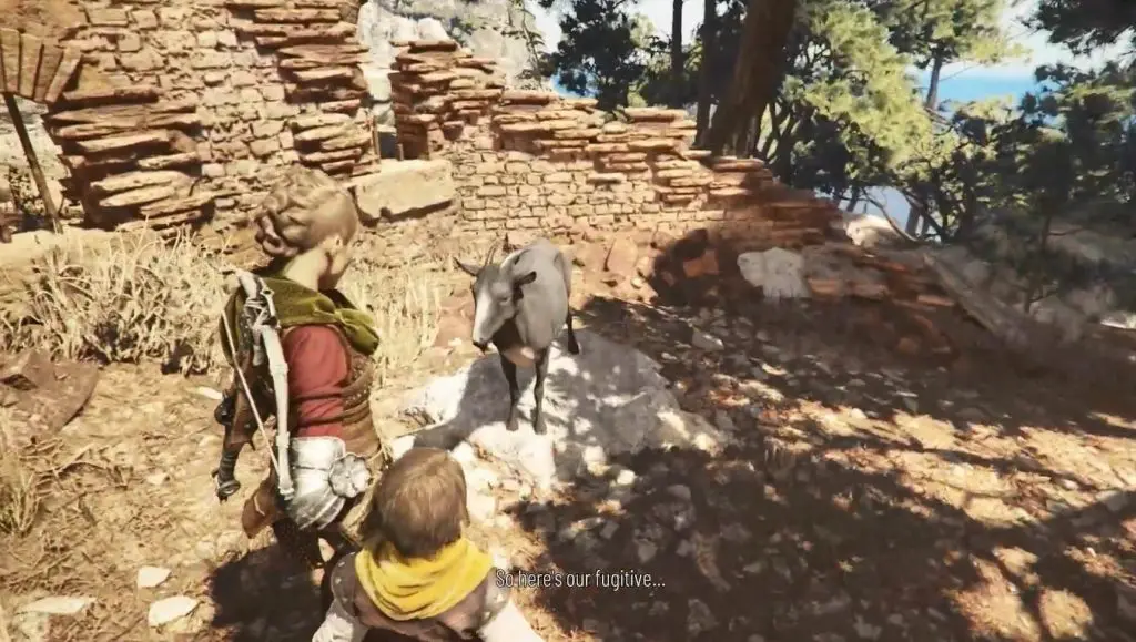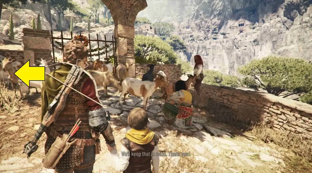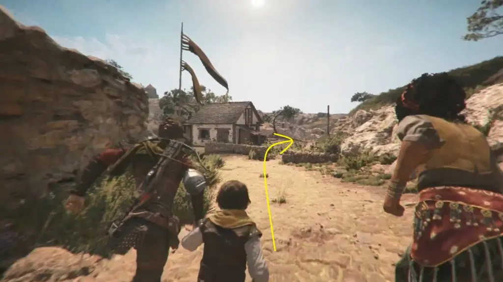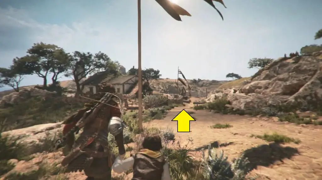 Continue along your normal route. After a short walk, you will come to a checkpoint that is blocked by goats. Climb the hill to the left and follow the path until you see a broken building.