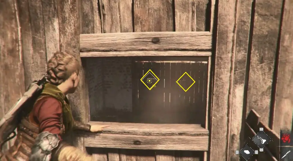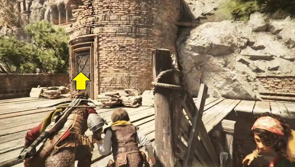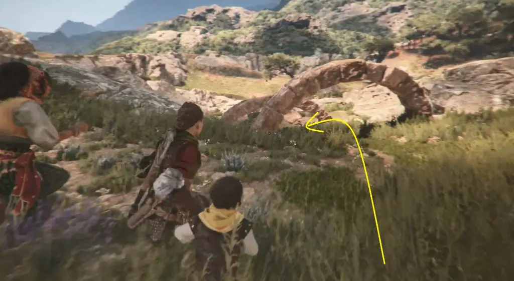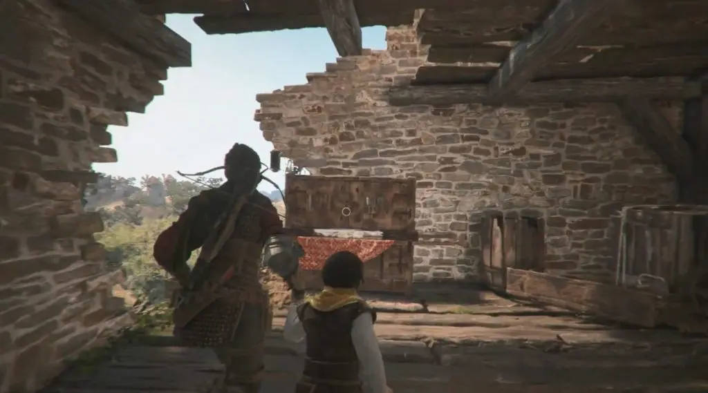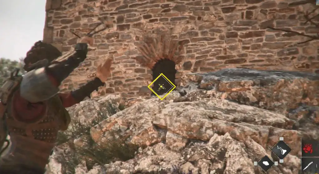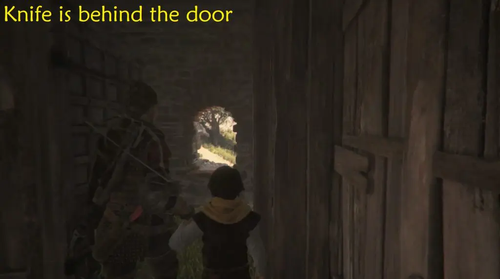Continue on your normal path and make your way to the mountain with the two large peaks. On the left, there is a ruined tower. Shoot through its window to break the door’s lock. Enter inside to find a knife behind the door.