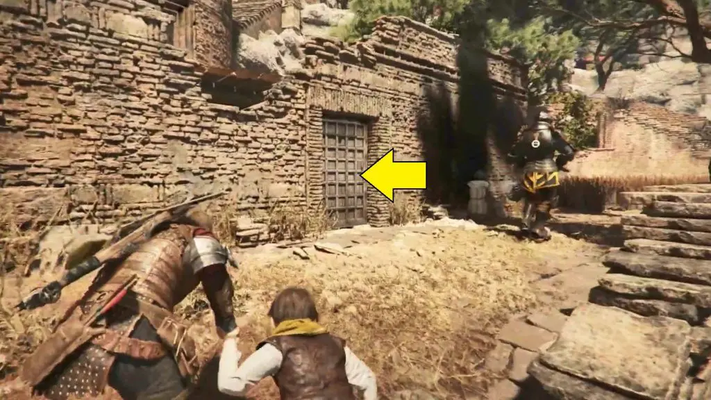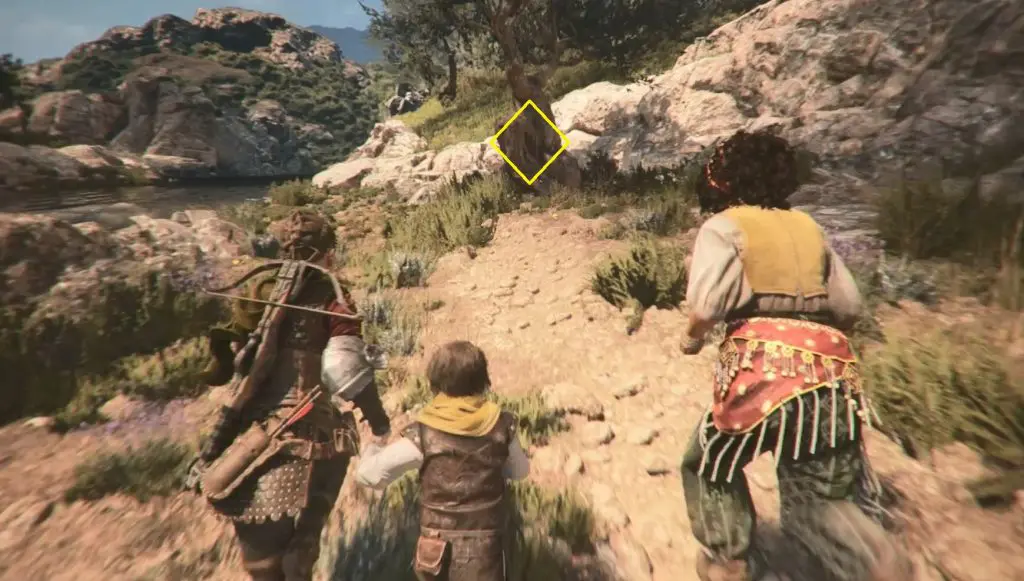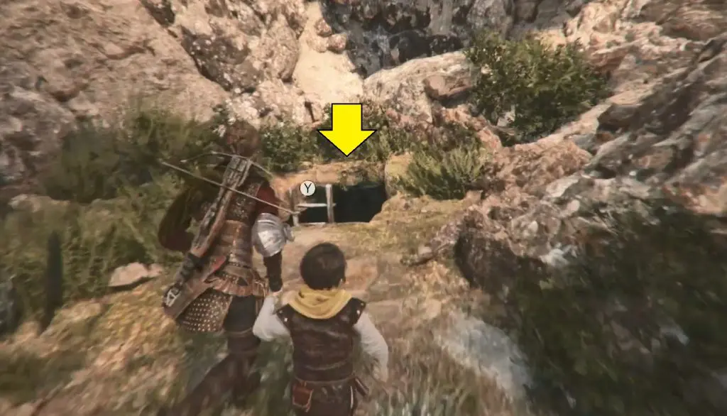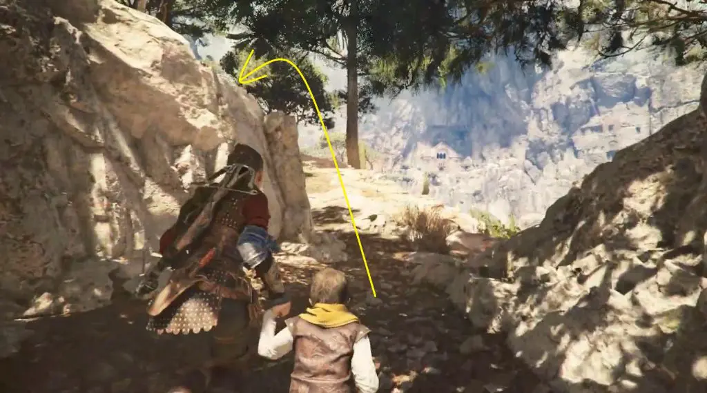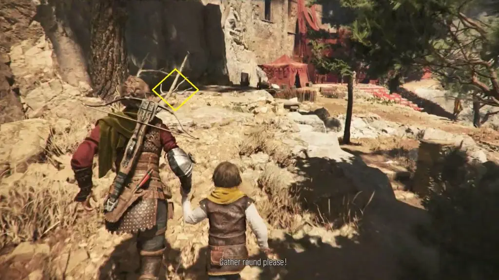 Continue on your normal path and make your way to the mountain with the two large peaks. On the left, there is a ruined tower. Shoot through its window to break the door’s lock. Enter inside to find a knife behind the door.