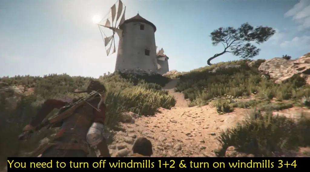 Follow the bird statues until you reach windmills on a hill. You need to turn off Windmills 1+2 & turn on Windmills 3+4.
