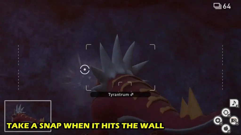 • Tyrantrum will chase the Monfernos and hit a wall. Take a snap when it hits the wall to fulfill the request.