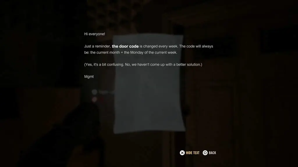 As per the note, the Door Code is changed every week. The code is always: Current Month + the Monday of the current Week.