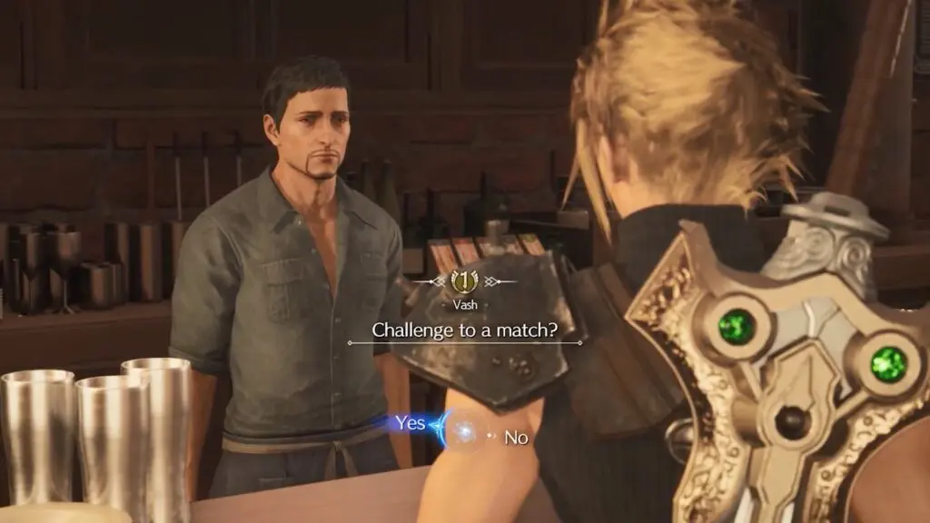 Interact with the bartender and accept his challenge in a game of Queen’s Blood. Successfully beat him in the match to advance to the next stage.