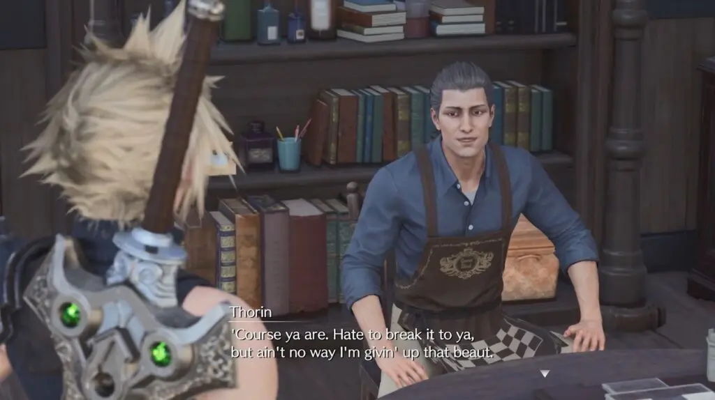 Go to Thorin’s Card Shop, located northeast of Kalm. Speak to her and beat her in a match. Alternatively, you can purchase two powerful cards from him for 500 gil each.