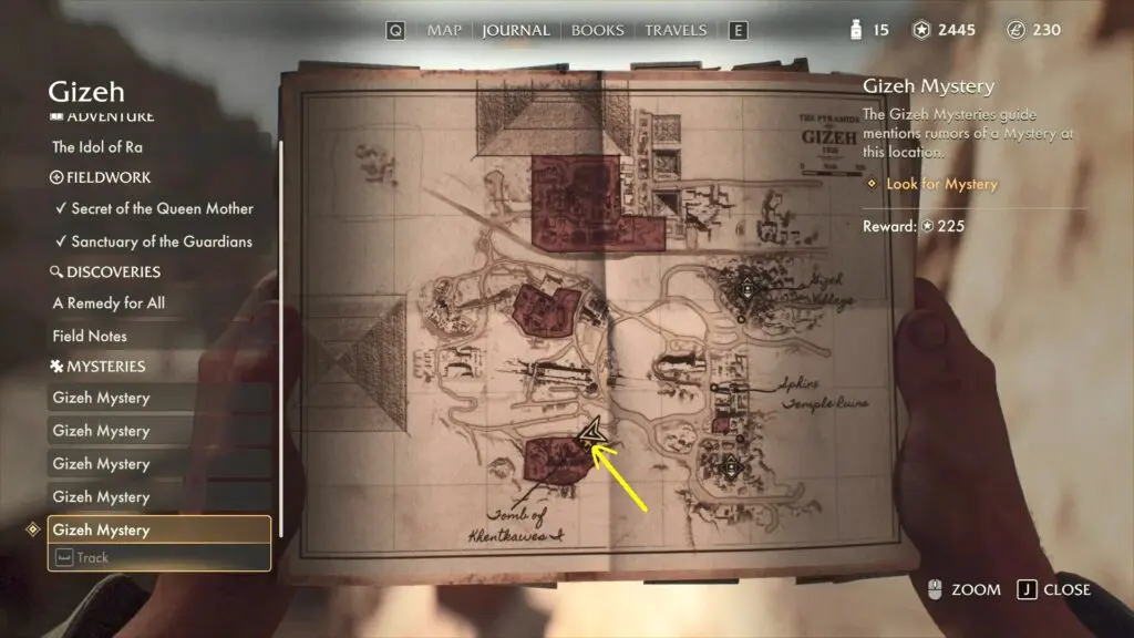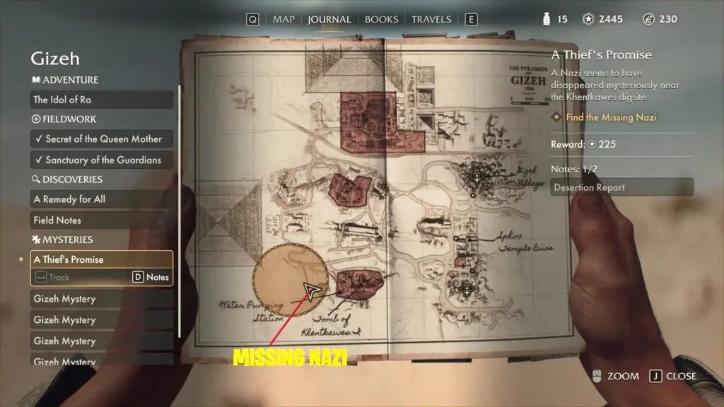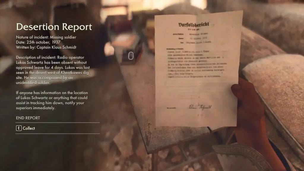 Go to the northeastern part of the Tomb of Khentkawes. Look for a tent, and inside, you’ll find a note called Desertion Report. Make sure to interact with the note to start the mystery.