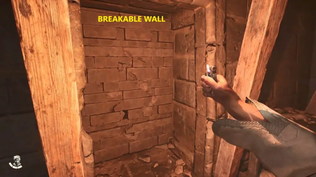 As you explore the cave, you will find a big pickaxe at the end. On the left side, you’ll notice a breakable wall.