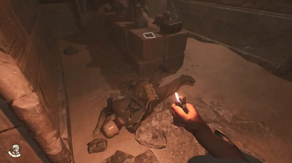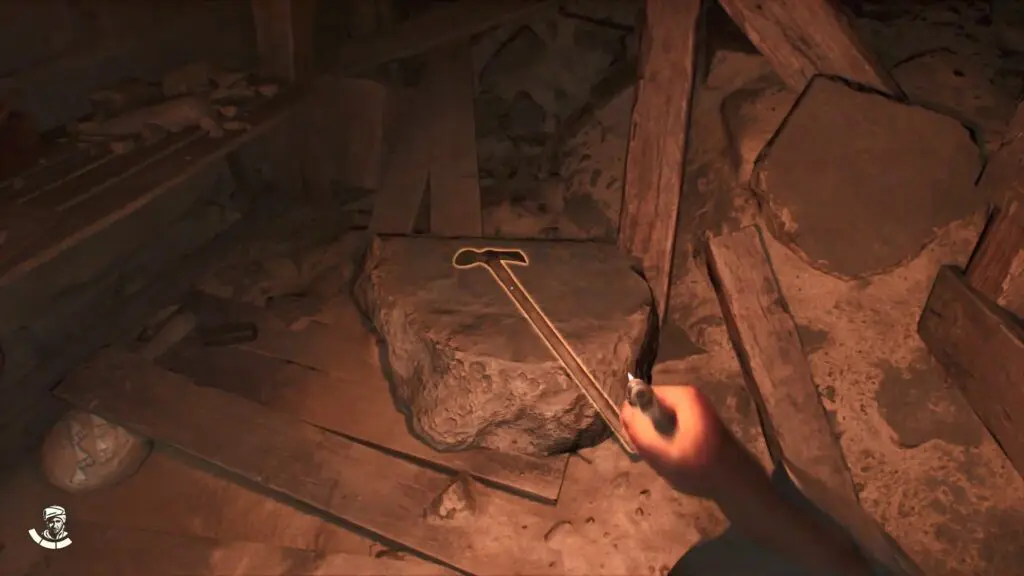 Use the pickaxe to smash through the breakable wall and enter the hidden area. Inside, you’ll discover the corpse of the missing soldier.