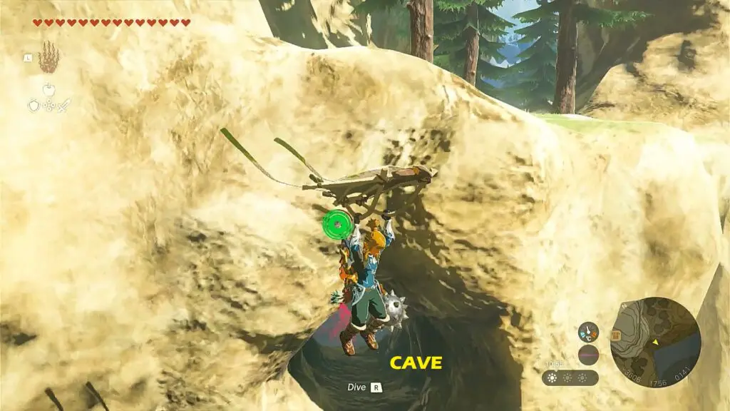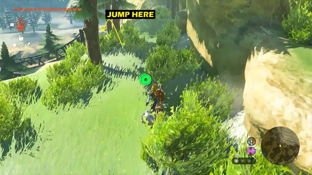 Jump from the cliff’s edge next to the bridge on the south side of Rito Village as shown in the pictures below. On the cliff wall, you will see a cave entrance as shown in the third picture below. Proceed into the cave and jump down the chasm to reach the Abandoned Hebra Mine.