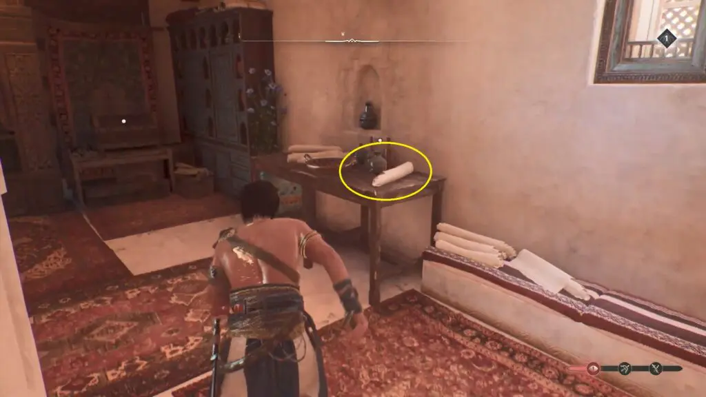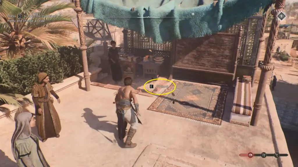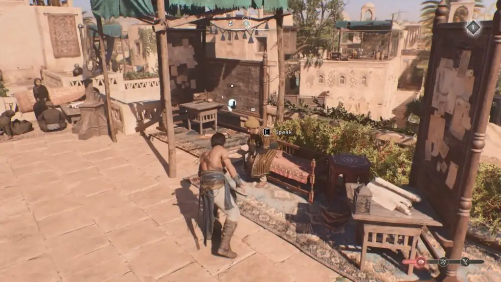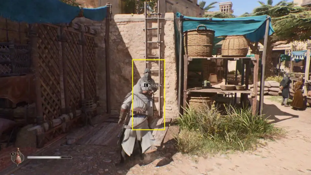 Speak with Naaji, a member of the Hidden Ones. He’ll seek your assistance in assassinating the guards. Follow him inside the market and fight all of the enemies there.