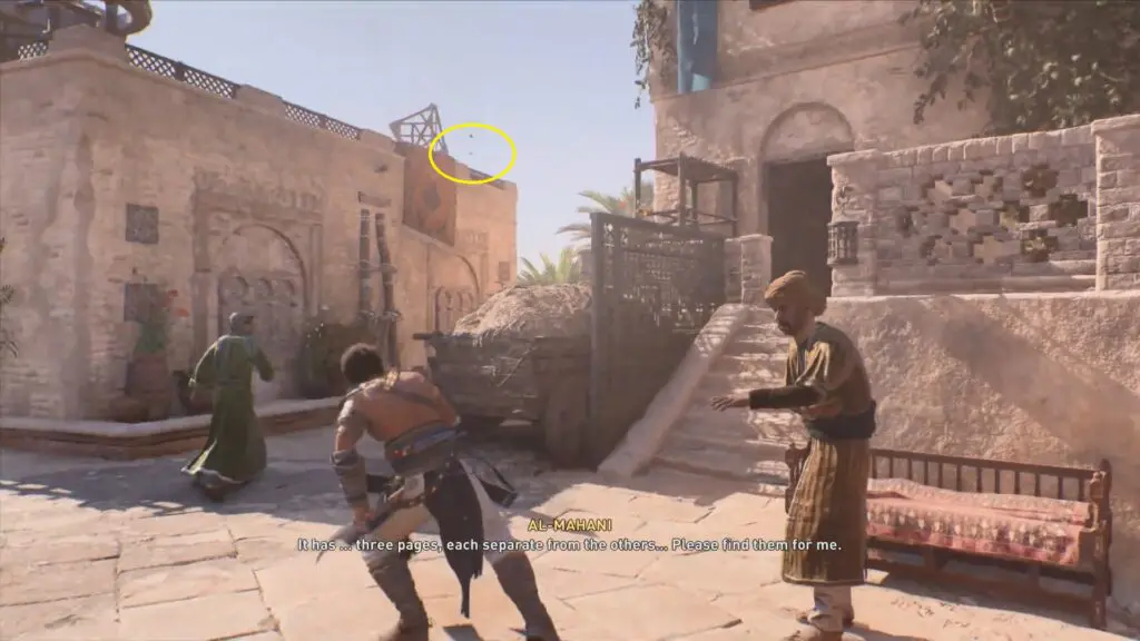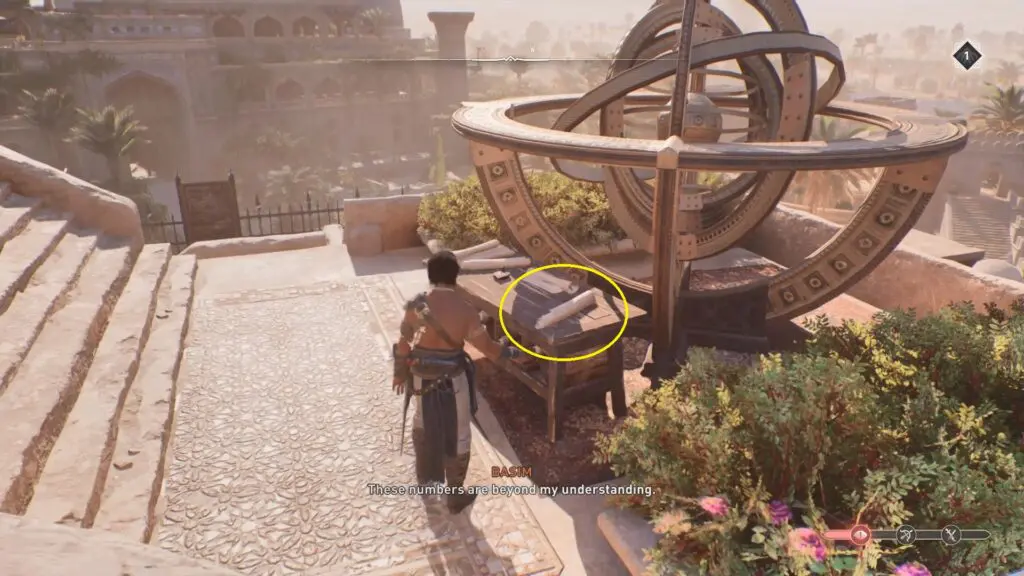 Go to the Observatory near Abbasiyah’s northernmost point, where you’ll find Al-Mahani sitting on a bench. Talk to him and he will complain of having severe chest discomfort. He will also want your assistance in locating his treatise.