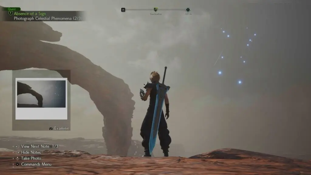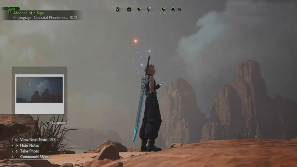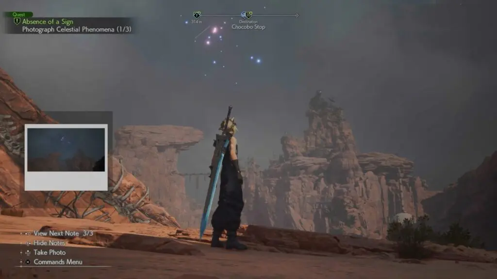 In this sidequest, the player is tasked with taking three Celestial Phenomena photos around the Cosmo Canyon region and defeating a strong fiend before taking a picture of the sky.