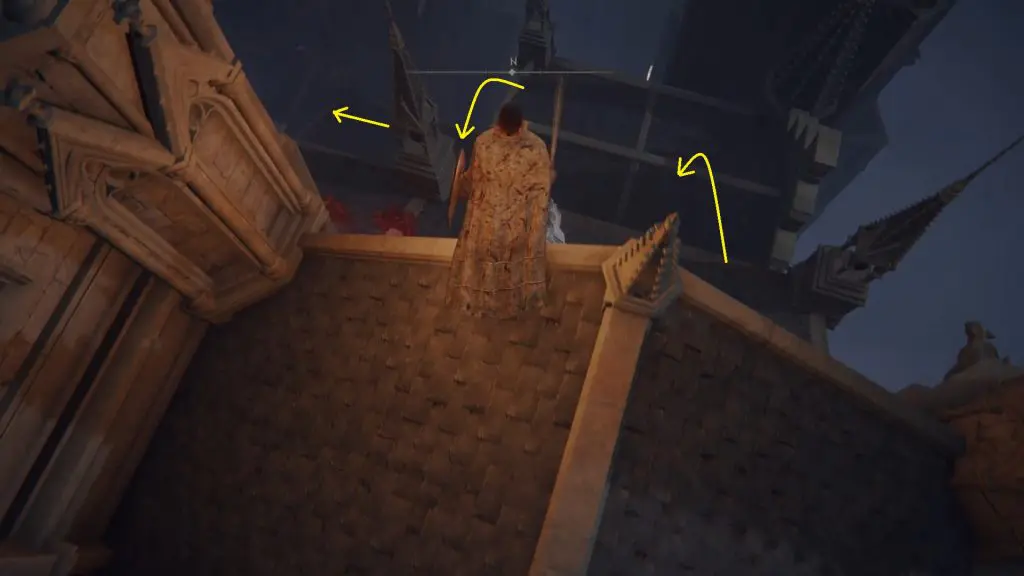 From there, jump down on the roof below. Then keep walking south on the roof until you reach the tower as shown below.