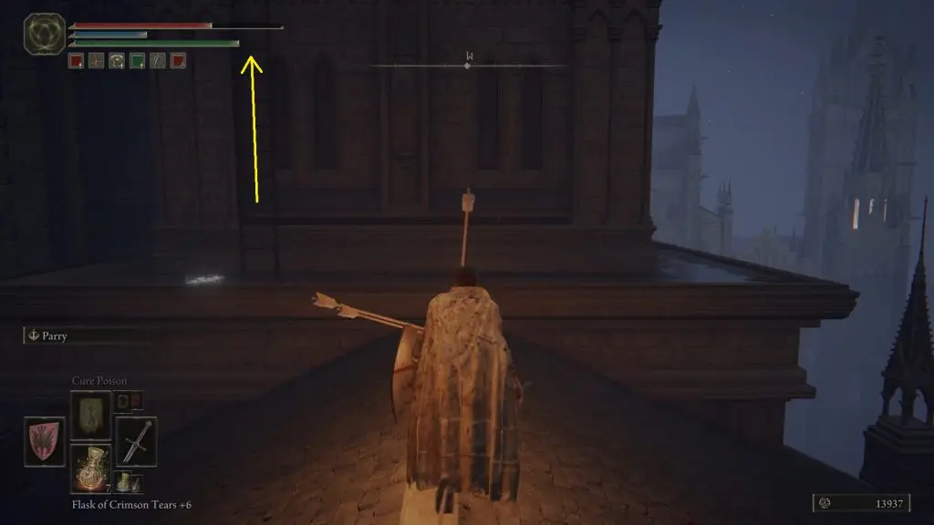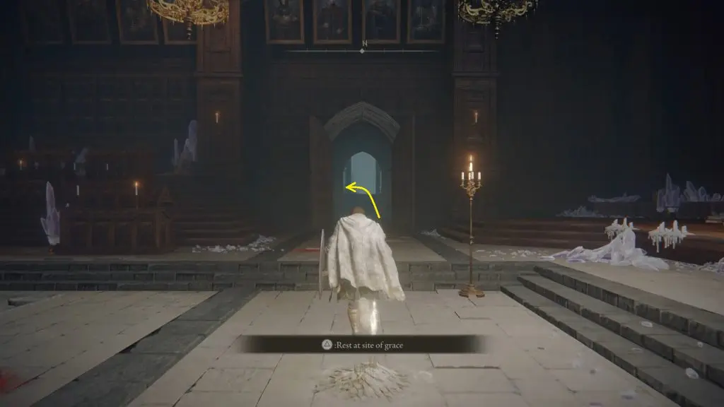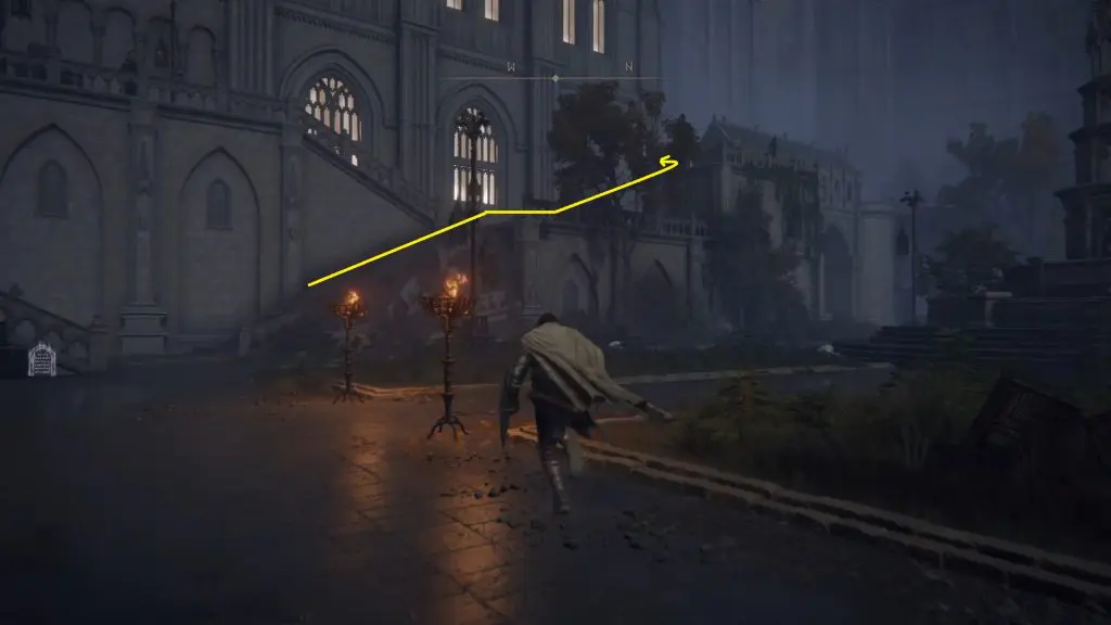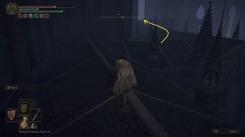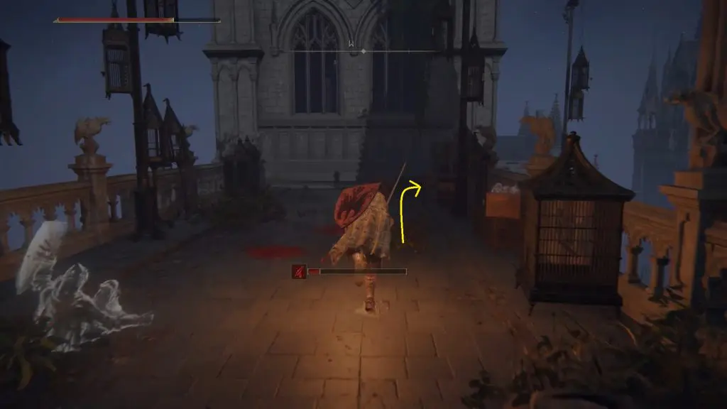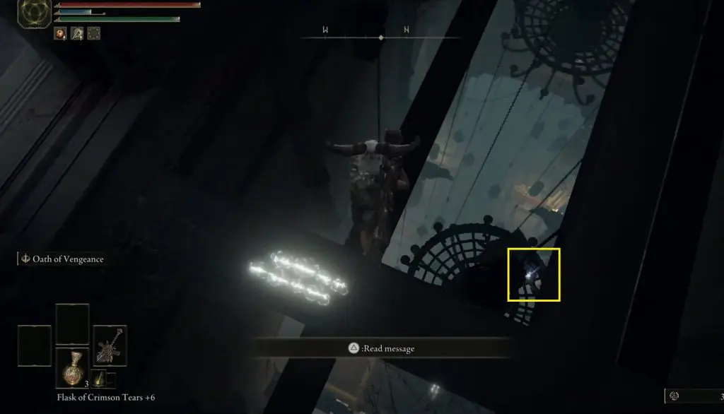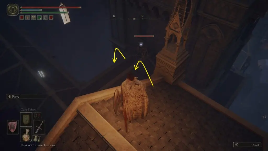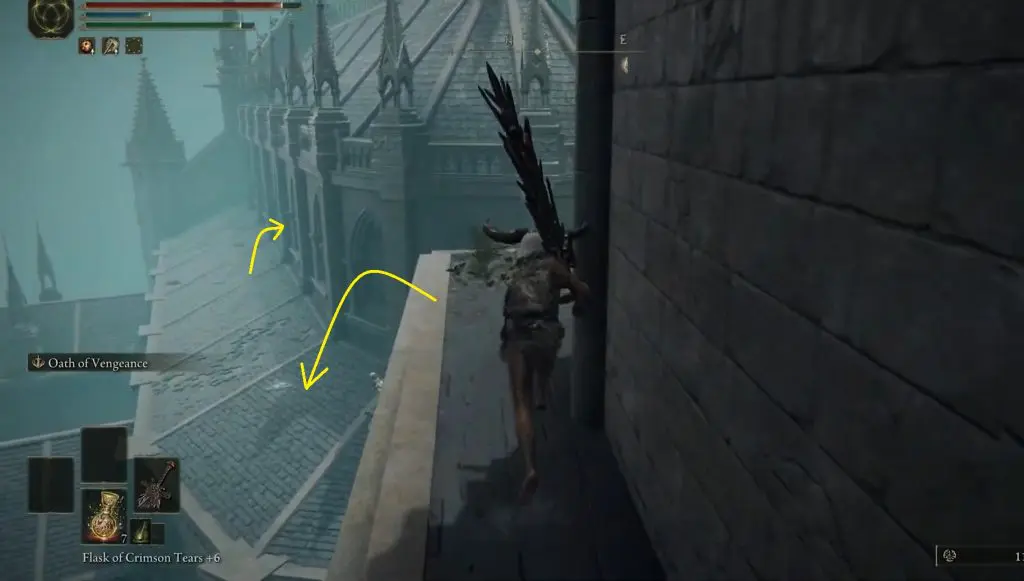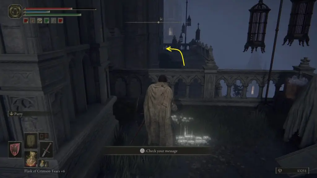 Walk on the beams of this building and jump down on the chandelier to get the Glintstone Key.