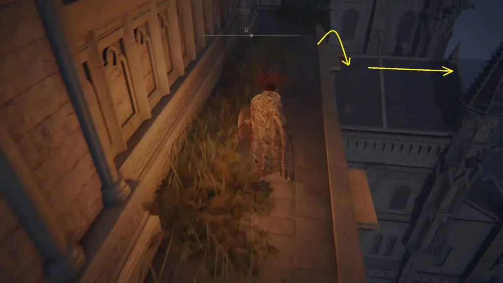 Jump down on the roof below. Go on the right side of this roof and jump down on the ledge below as shown in the picture below.