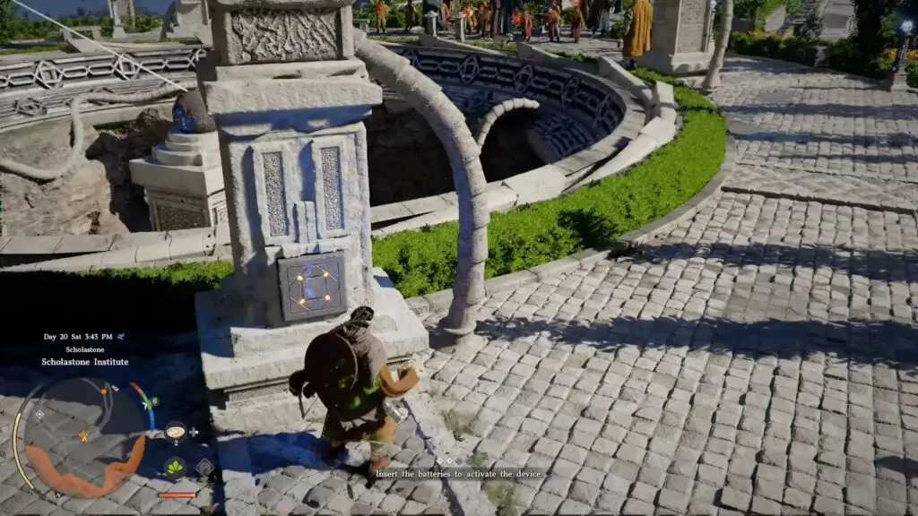 Head back upstairs to the spherical structure. You will now see four pillars arranged around a central device, each with a slot for a battery. There are 4 batteries placed nearby. To power the device, you need to place all four batteries into the pillars.