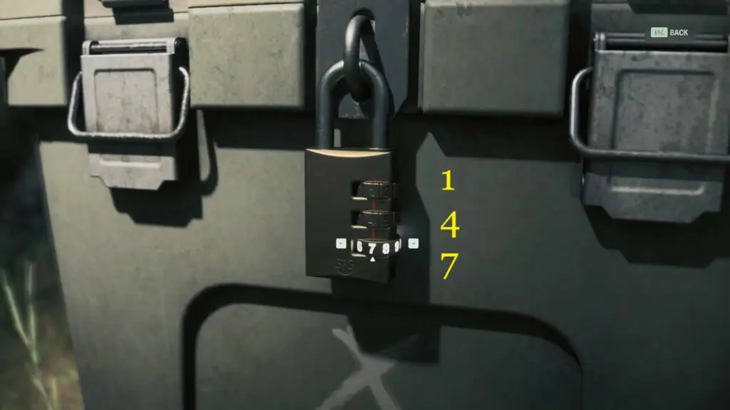 Shine your flashlight on the rock that is closer to the crate. The code to unlock the stash is = 6-5-8.