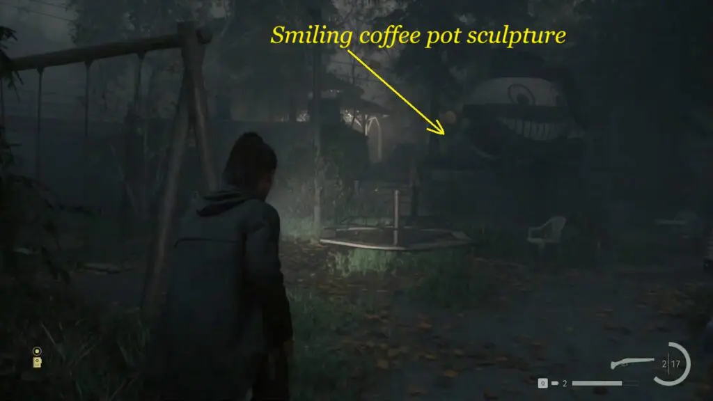 The hint “behind the smile” refers to the happy coffee pot that is the mascot of Coffee World. You can spot this mascot all around Coffee World, mostly on signs. The big coffee pot sculpture near the gazebo is the one with the cheerful smile.