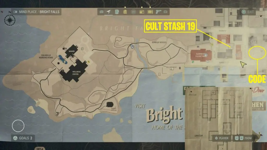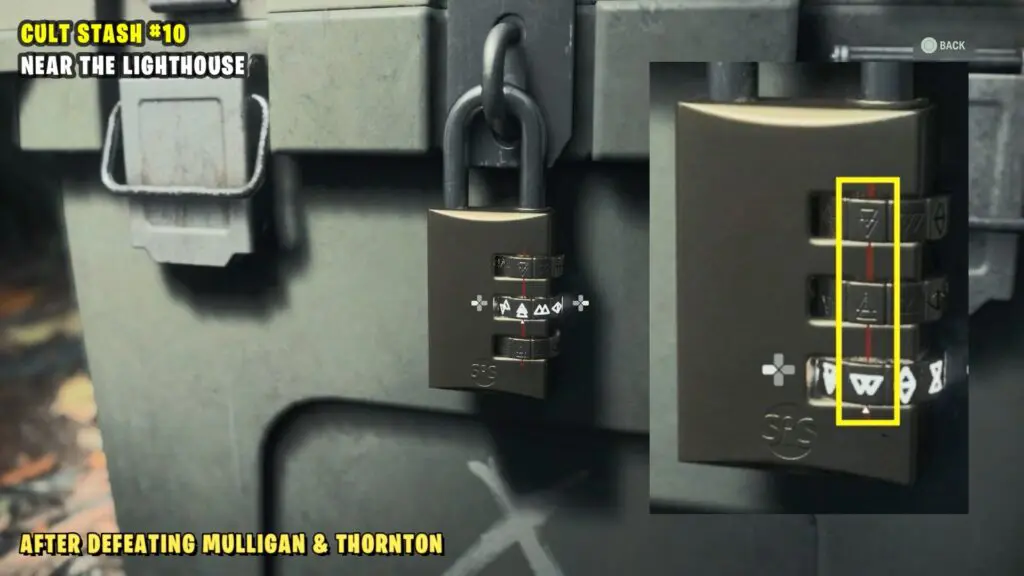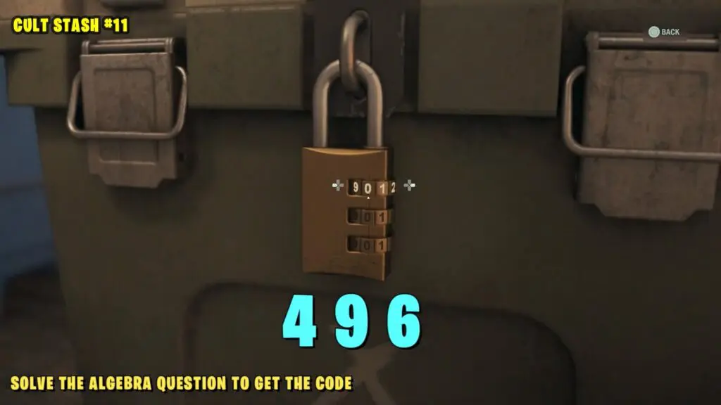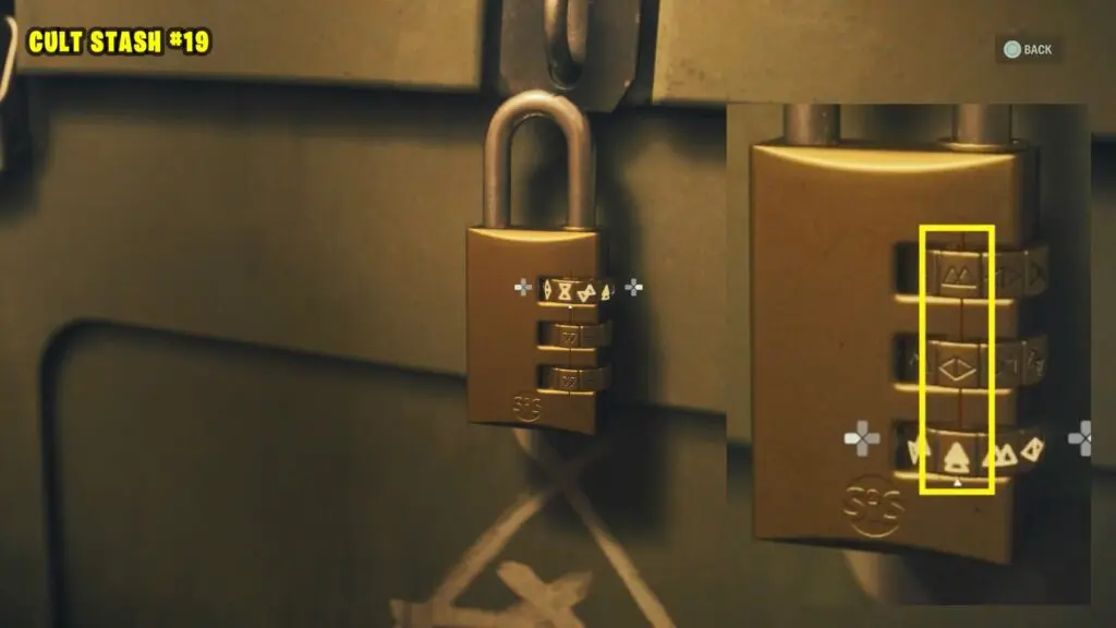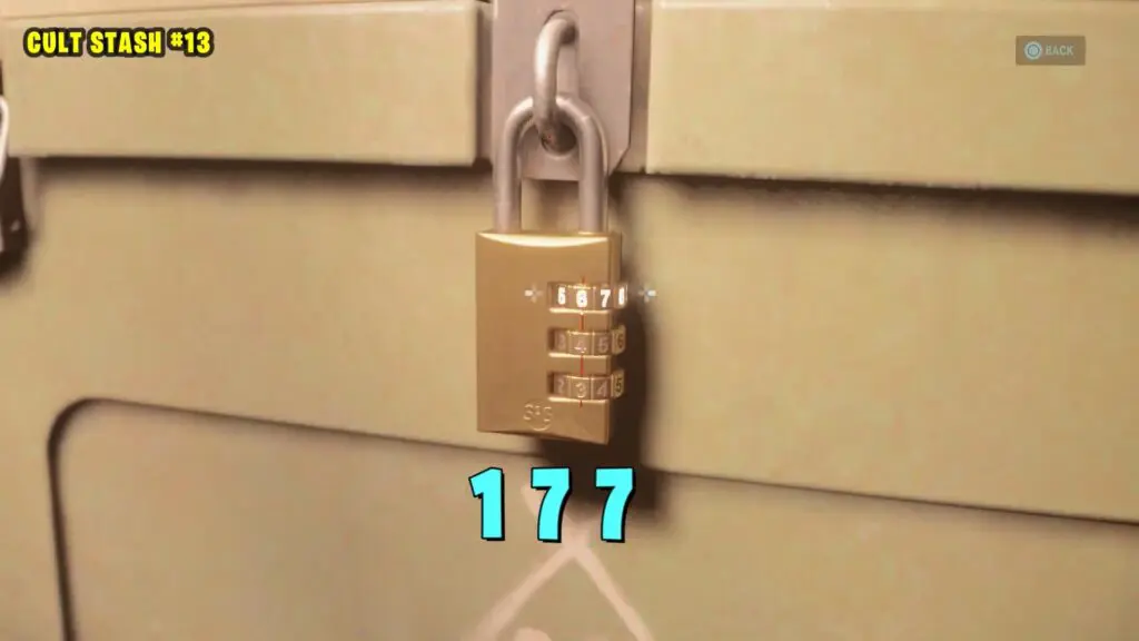 Follow the trailer directly south of the Murder Site to reach the Cult stash. The stash is located right outside the house and to open it look for symbols on the lock based on the hints on the note. Symbols are inside the house.