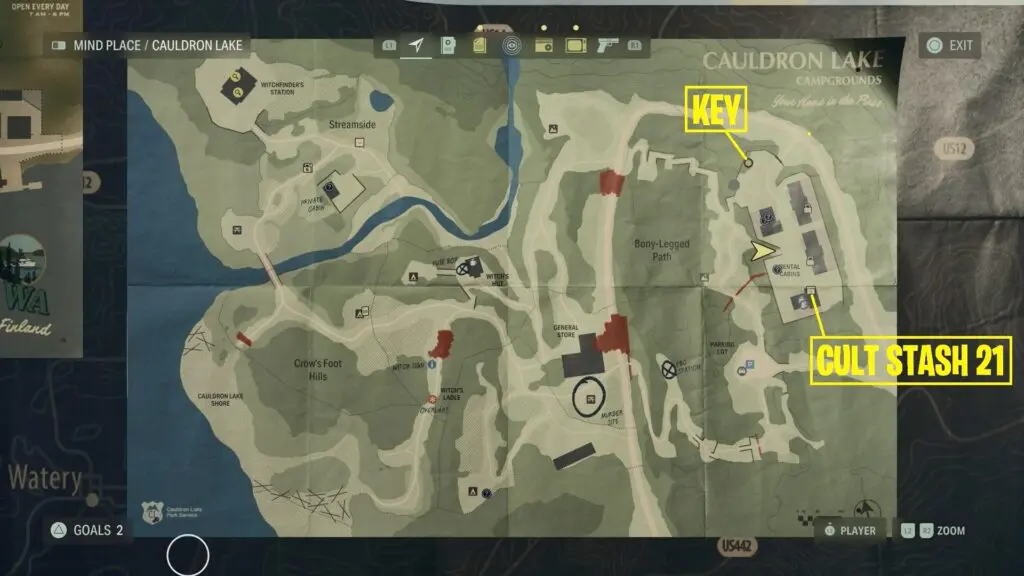 Go north, and you’ll come across some trees with numbers painted on them. Look behind the tree with the number 2 to discover a Lake Cabins Stash Key on the ground.
