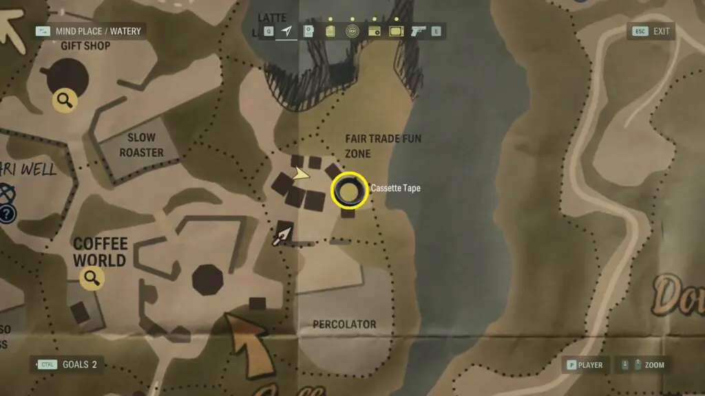 Inside the Fair Trade Zone, you’ll come across a funny motorized coffee board with a waving arm that smiles. Go to the back of this board to discover the Cassette Tape attached to it.