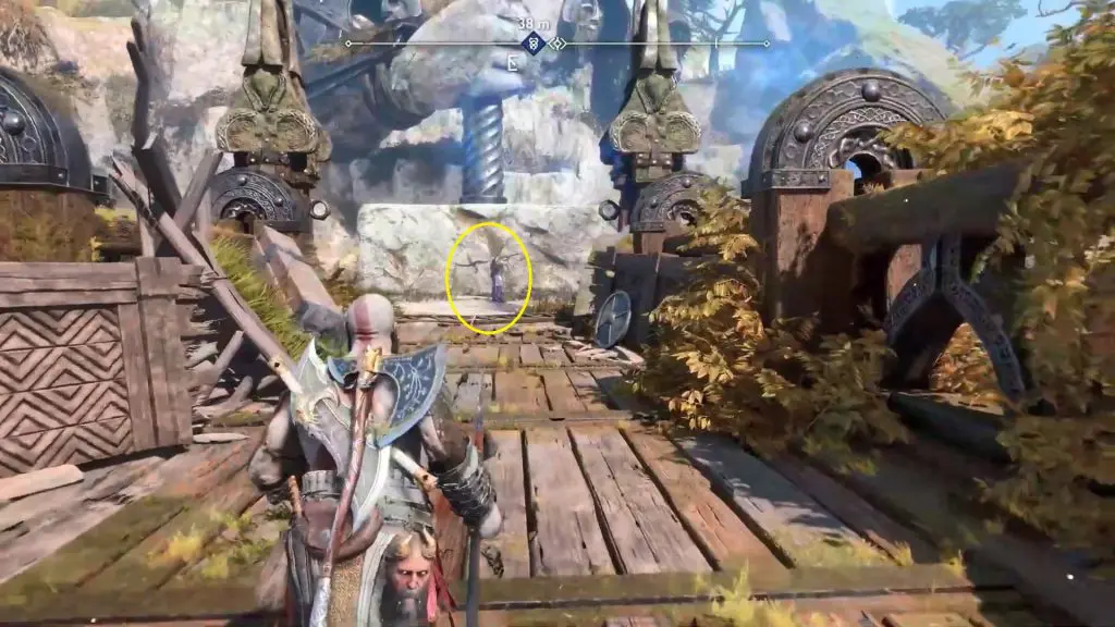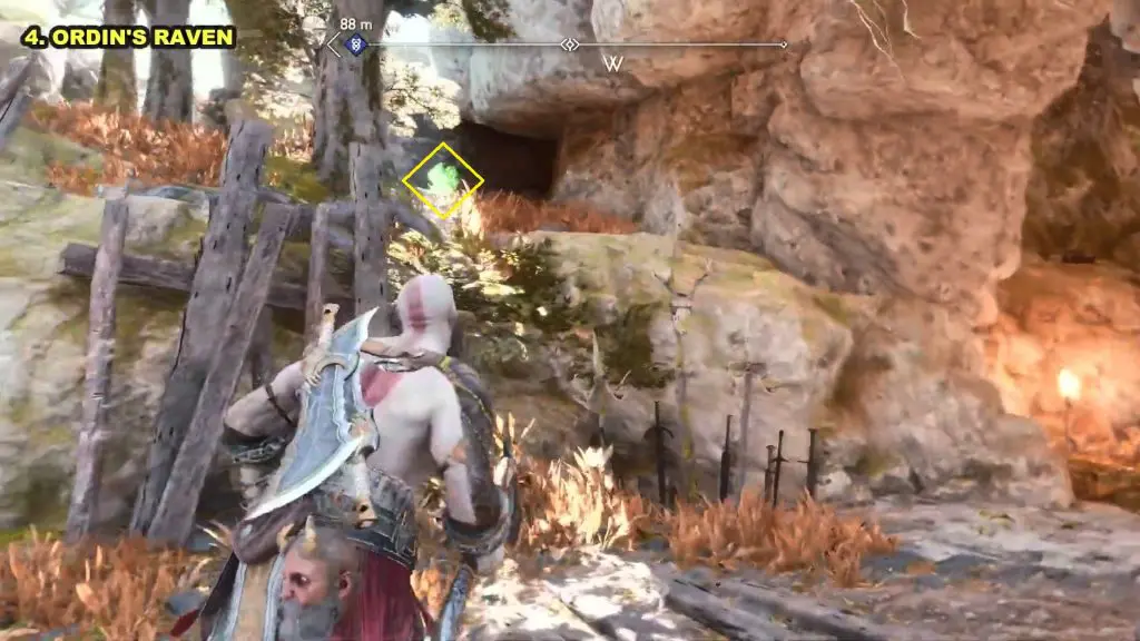 Blast the golden ore to clear the path. You will find Odin’s Raven on the left side of the path, sitting under a tree.