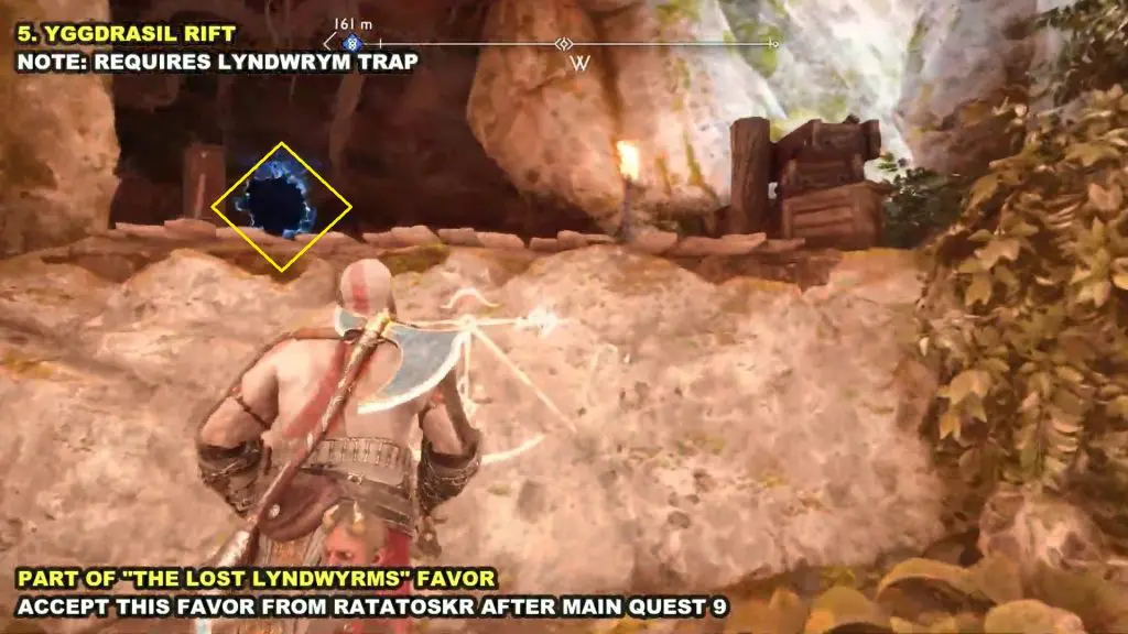 Note: For this collectible, You must have accepted “The Lost Lindwyrms” Favor from the Squirrel at Sindri’s house after Main Mission 09: Word of Fate. This Yggdrasil Rift contains a Lyndwyrm for “The Lost Lindwyrms” Favor. After pulling out the Lindwyrm, interact with the rift a second time to make it count as completed.