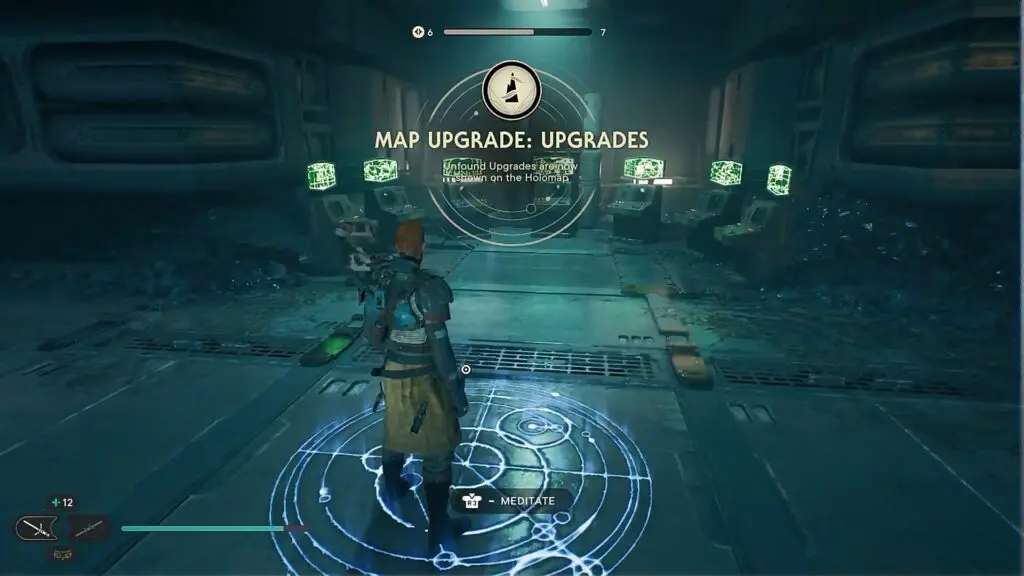 After completing the seven chambers, when you come back to the Alignment Control Center, the computer screens would have turned green as shown in the picture below. Now you can interact with the terminal in front of the computer screens as shown in the second picture below to get a map upgrade. This upgrade will show all the unfound upgrades on your map. This completes the puzzle.