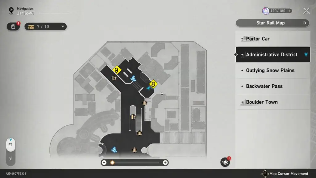 Go to Central Plaza Space Anchor and go to the guard NPC where you got chest 7. You’ll notice Belobog’s guards block off two sets of staircases, and unfortunately, that’s where you need to go to find the last chest. You have to complete the main storyline for Belobog and Jarilo-VI to be able to go down the stairs. Once you finish this story, you can go down the steps and into map B1 to find the last chest.