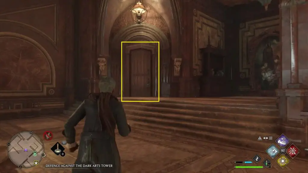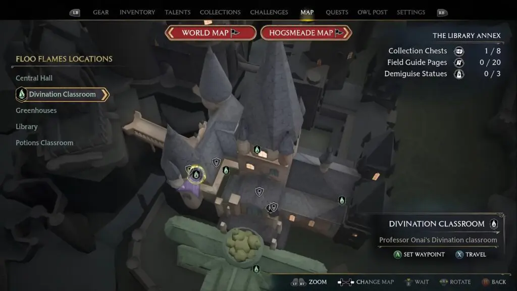 Climb up the stairs next to the Divination Classroom Floo Flame. Then climb up the ladder there to reach the Divination Classroom, where you will find the Demiguise Statue.