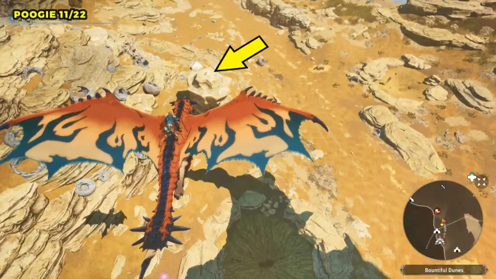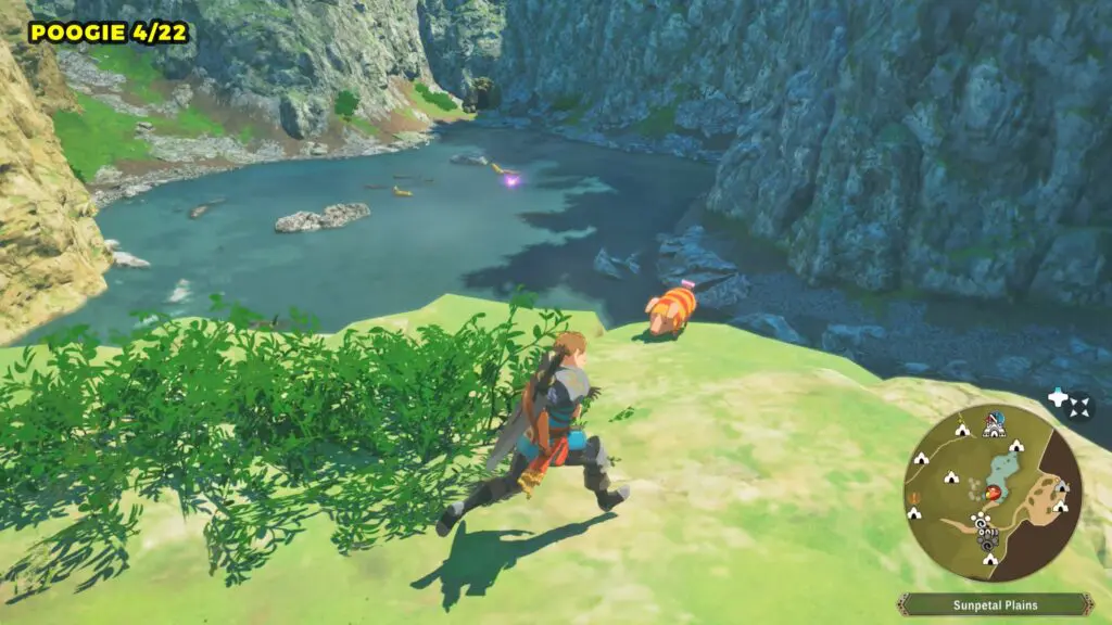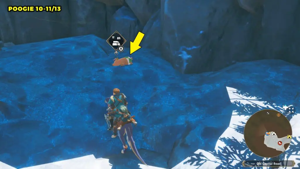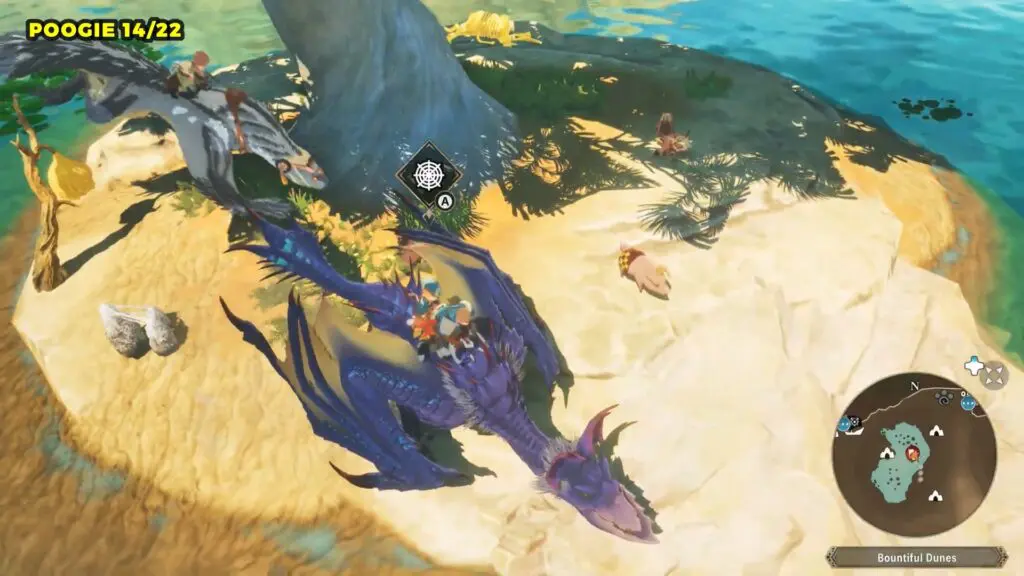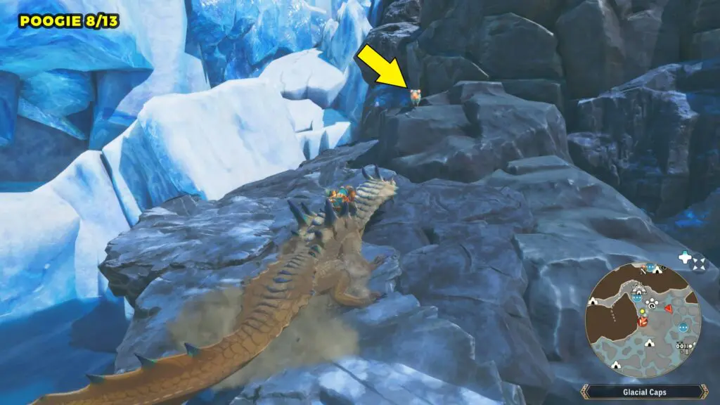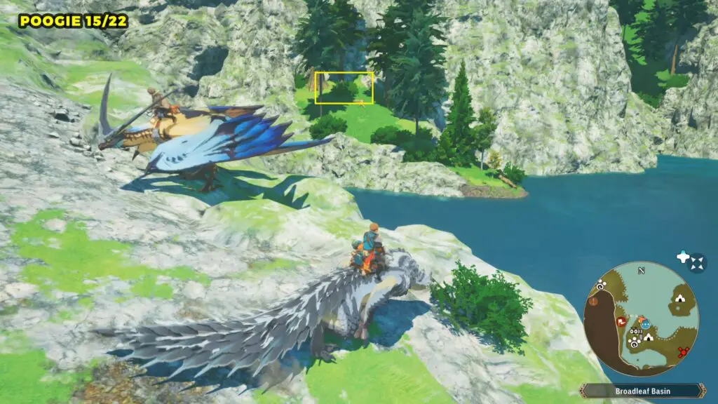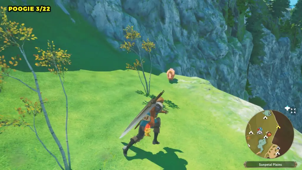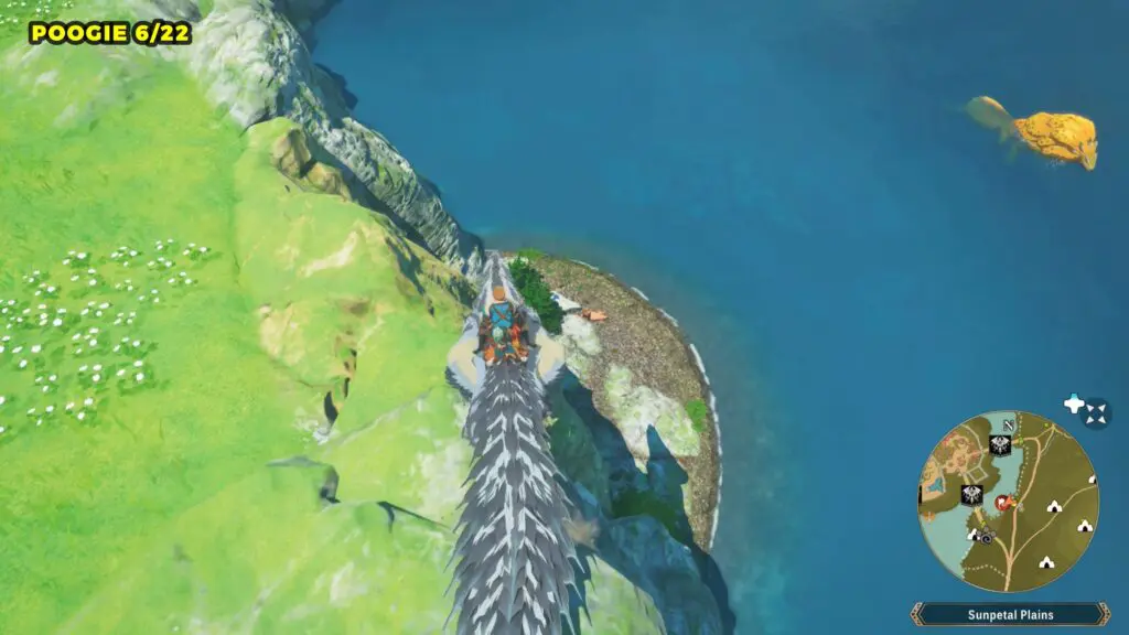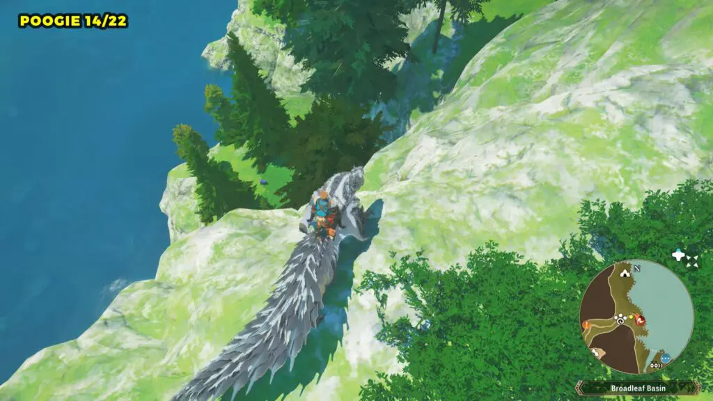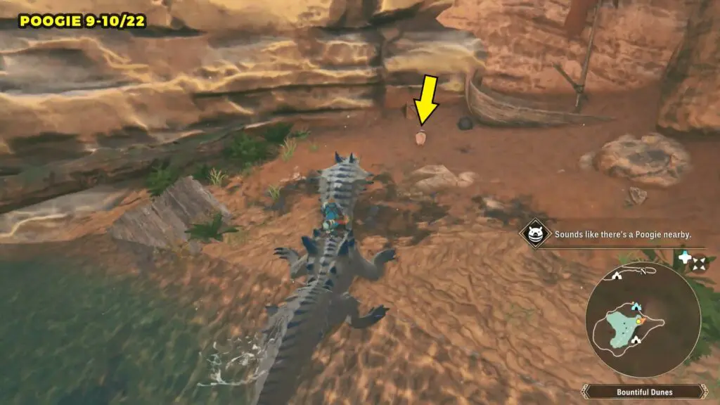 This Poogie is located on a cliff north of the lake, but it won’t appear right away. Head to the northern cliffside and use a Monstie with Ground Dive to uncover it. Once you use the ability, the Poogie will be revealed nearby.